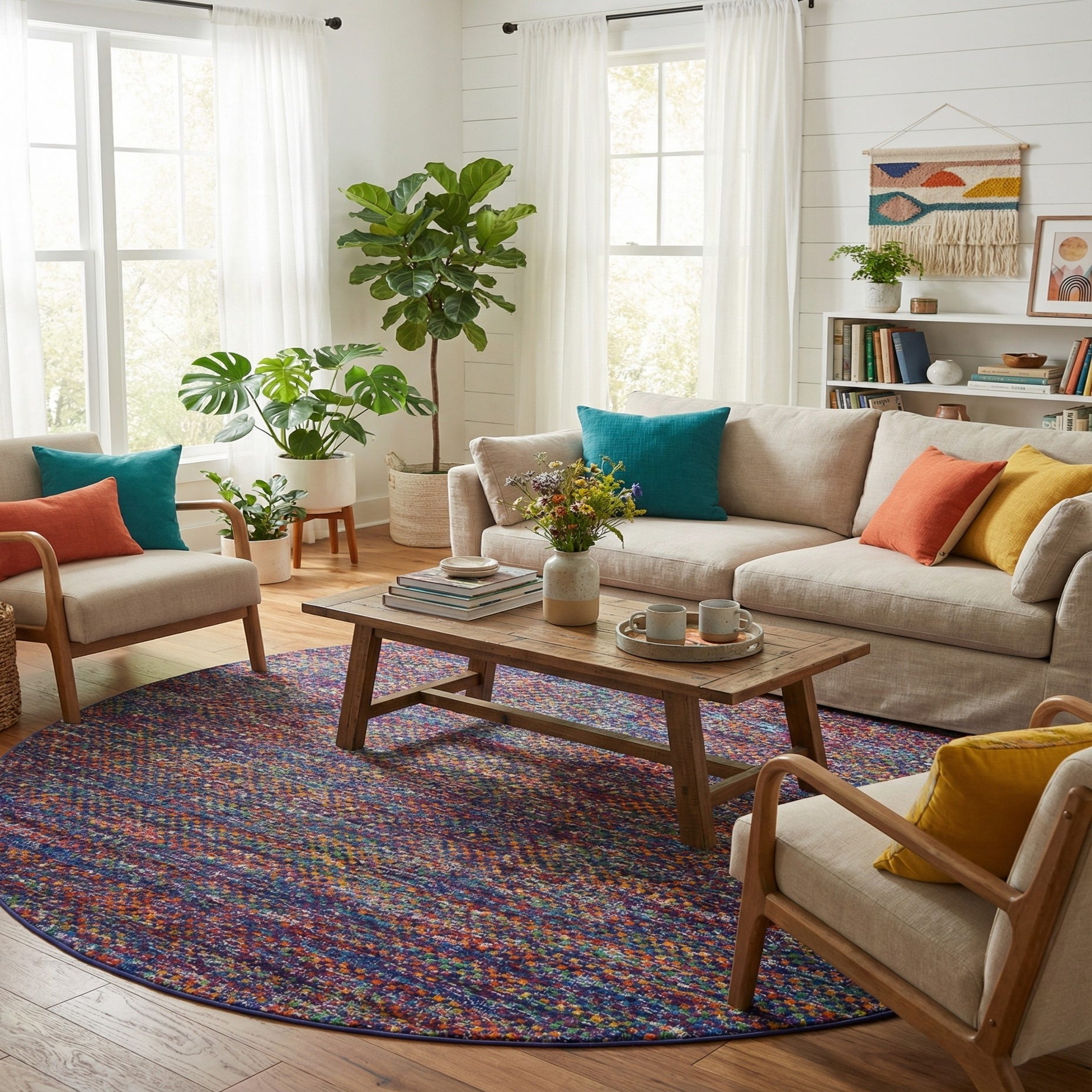 The lively palette and compact pattern make this rug well-suited to contemporary and eclectic interiors. Place it beneath a round coffee table to anchor a living area, use it under a dining nook to introduce color without competing with patterned upholstery, or layer it over hardwood in a home office or playroom for warmth and visual interest. It pairs easily with natural woods, navy or neutral seating, and rattan or mid-century modern pieces to create a balanced, inviting space.