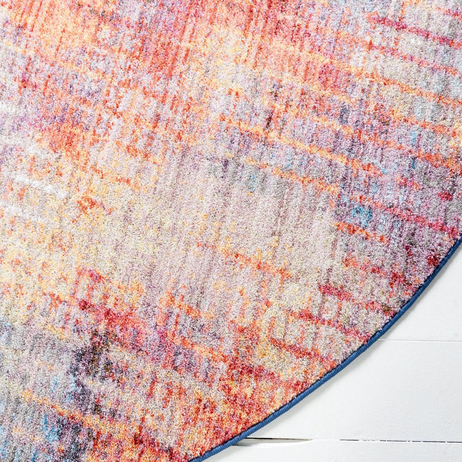 An abstract, painterly surface of soft grids and blurred washes gives this round rug a modern, lived-in look. Layered linear marks create a subtle cross-hatch pattern that plays with light and depth, while a multi background brings together beige, blue, gray, orange, red, yellow, violet, pink and peach in gentle, space-dyed variations. Machine-made of 100% polyester (space-dyed yarn), the low-profile pile feels soft underfoot and offers a slight, tactile texture that highlights the color shifts without adding bulk.