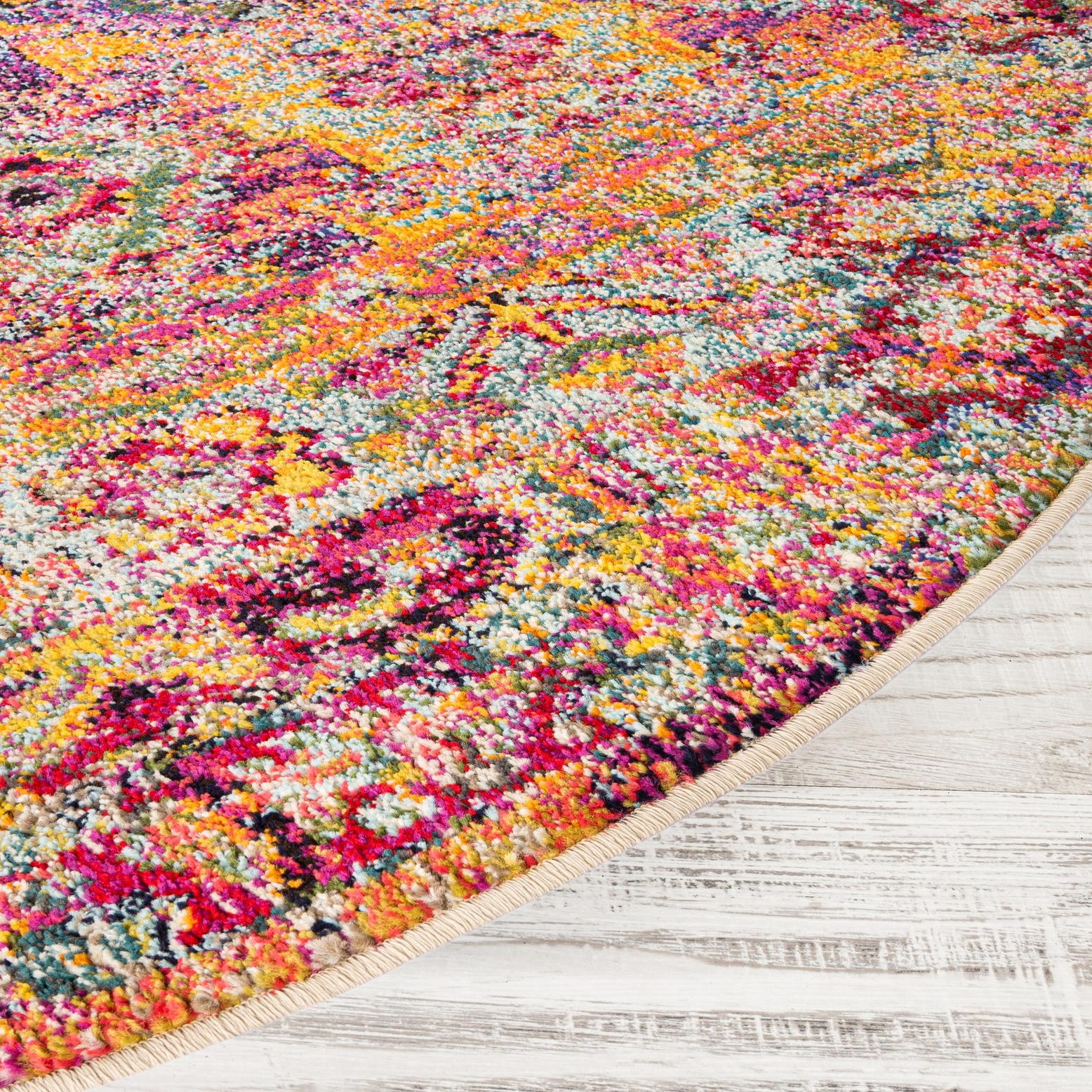 A round rug with a layered, vintage-inspired pattern that blends medallion, floral and geometric motifs. The background is multi, and the palette mixes maroon, navy blue, light blue, gold, orange, yellow and shades of blue to create a lively, well-worn look. Colors are woven together in a distressed, almost painterly weave that highlights individual motifs while maintaining an overall, collected feel.