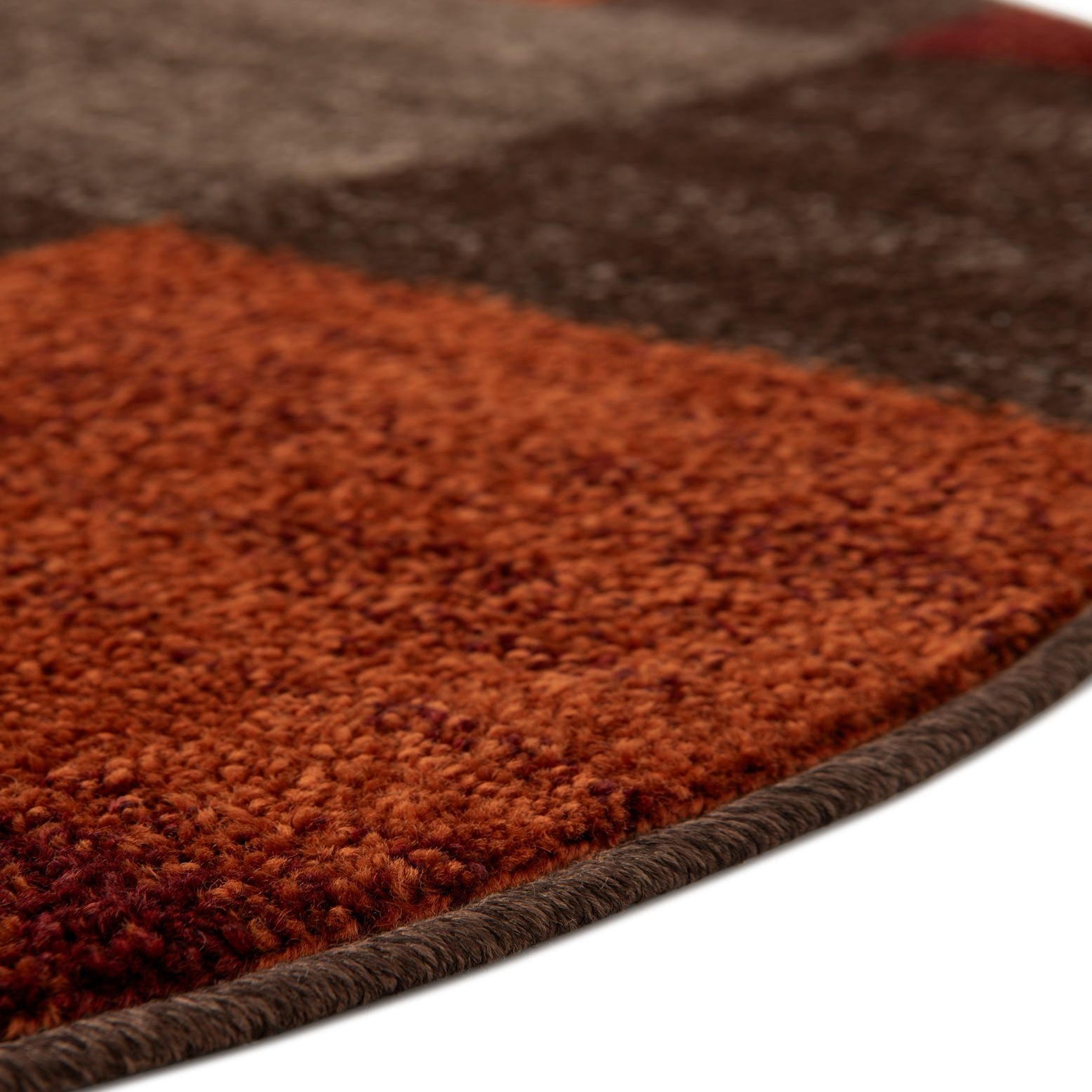 A contemporary round rug with a geometric patchwork pattern, this piece places rectangular and square blocks in a balanced, modern layout. The multi-tonal background anchors rich fields of beige, brown, burgundy and orange, with subtle striations and a slightly distressed look that adds visual depth without overt ornamentation. Machine-made of 100% polypropylene, it has a low, dense pile with a smooth hand that lays flat and feels comfortable underfoot.