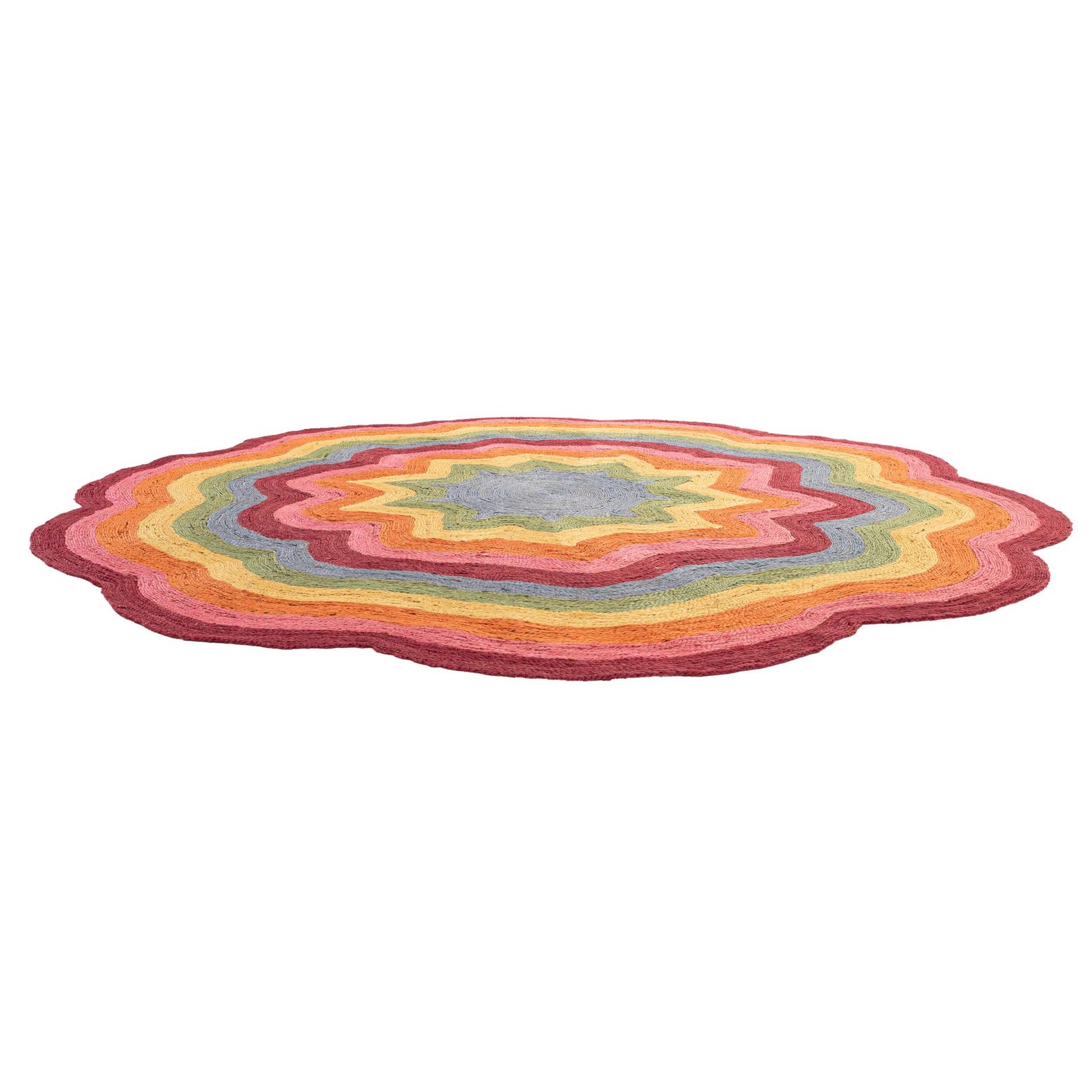 A vibrant, multi-colored round jute rug with a modern, scalloped floral pattern, featuring concentric rings of red, pink, orange, yellow, green, and blue.