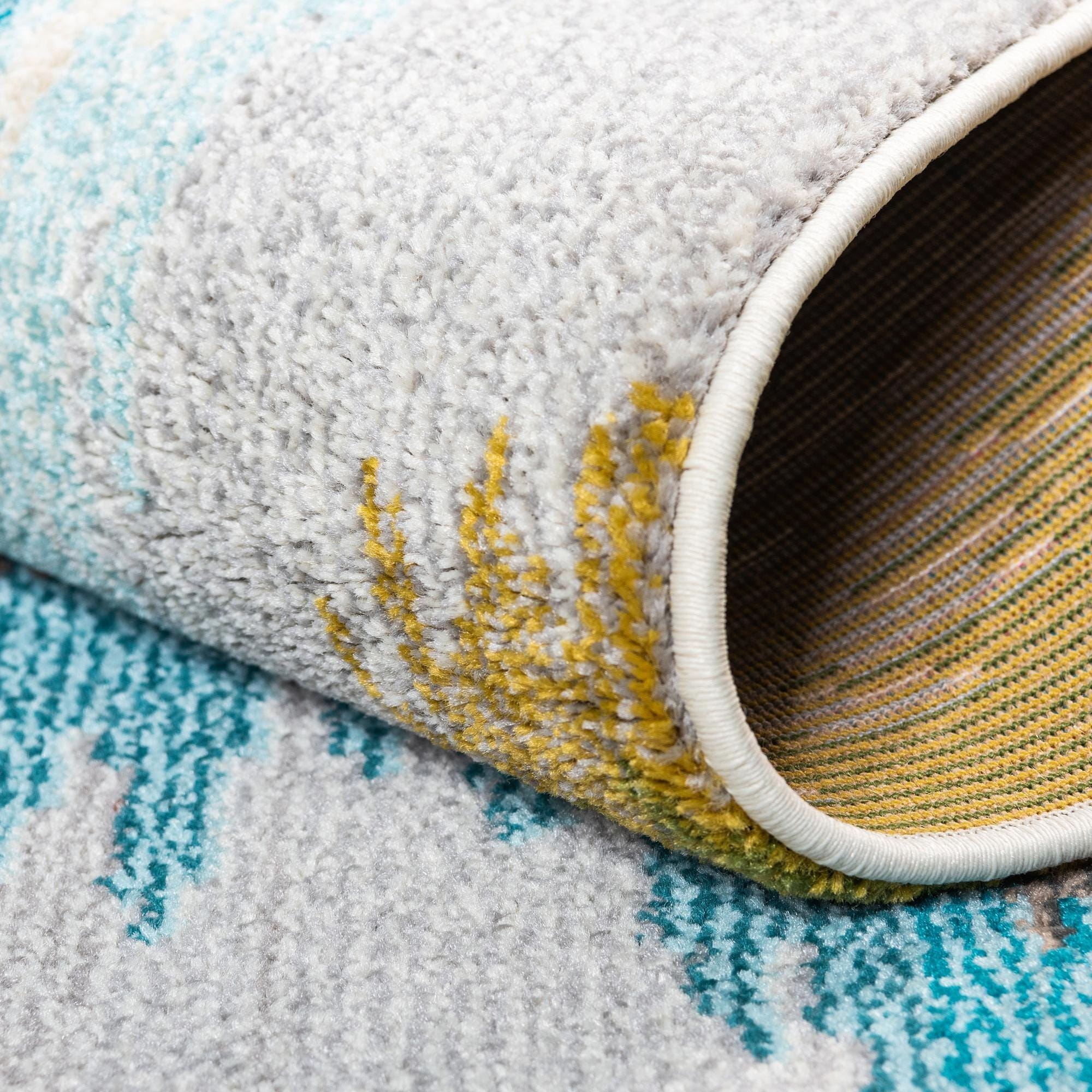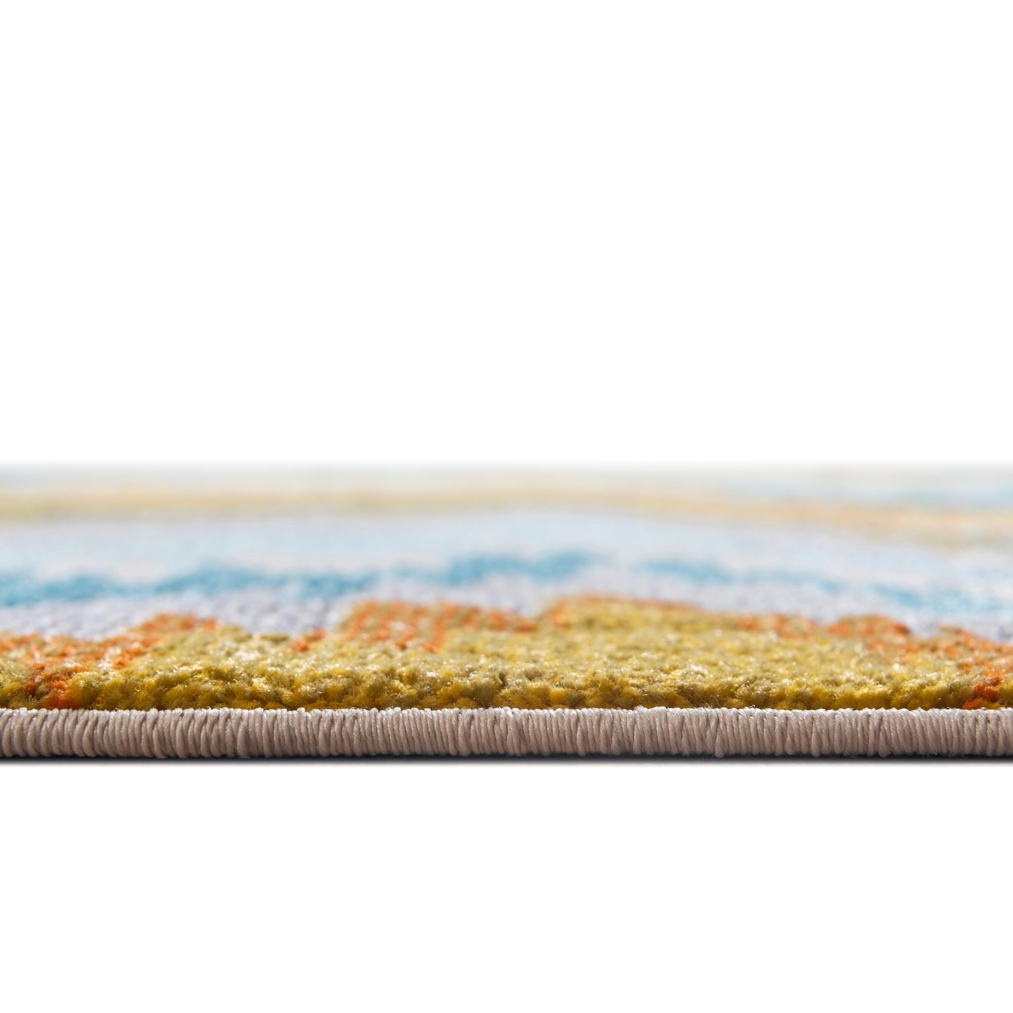 A lively, ikat-inspired chevron pattern runs across a multicolored background, rendered in painterly, jagged waves of mustard yellow, teal and light blue, tempered by beige, gray, olive green and small orange accents. The machine-made construction in 100% polypropylene gives the surface a smooth, low-profile pile that feels soft underfoot while keeping the sharp edges of the design crisp and defined. The round silhouette emphasizes the rug’s sweeping motion, turning the layered color bands into a cohesive punctuation point for a room.