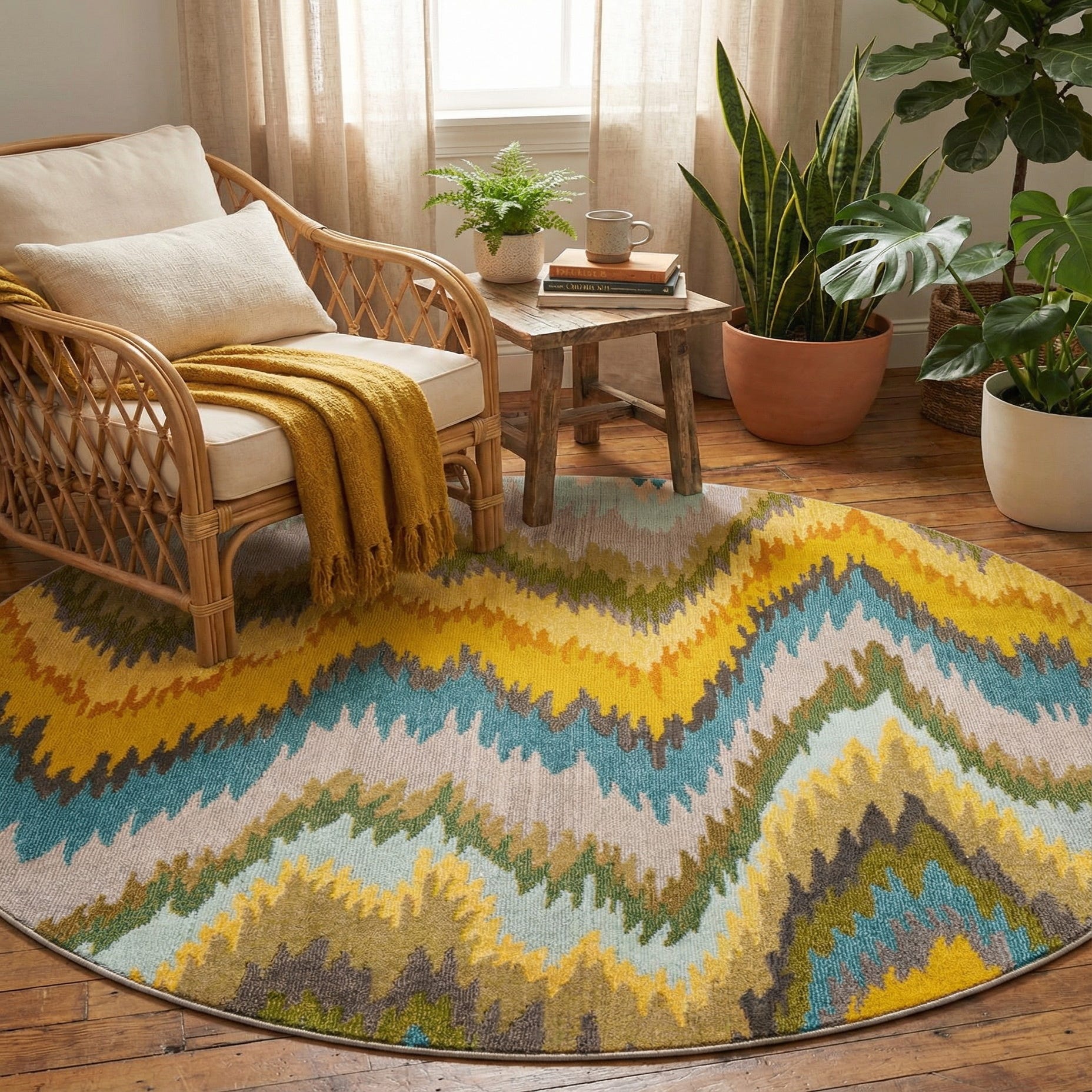 A lively, ikat-inspired chevron pattern runs across a multicolored background, rendered in painterly, jagged waves of mustard yellow, teal and light blue, tempered by beige, gray, olive green and small orange accents. The machine-made construction in 100% polypropylene gives the surface a smooth, low-profile pile that feels soft underfoot while keeping the sharp edges of the design crisp and defined. The round silhouette emphasizes the rug’s sweeping motion, turning the layered color bands into a cohesive punctuation point for a room.