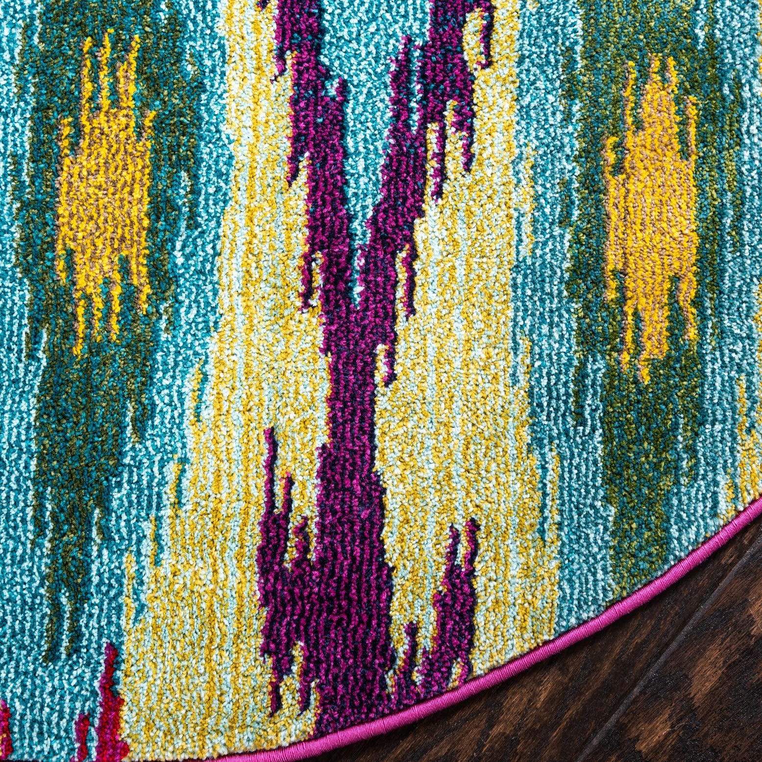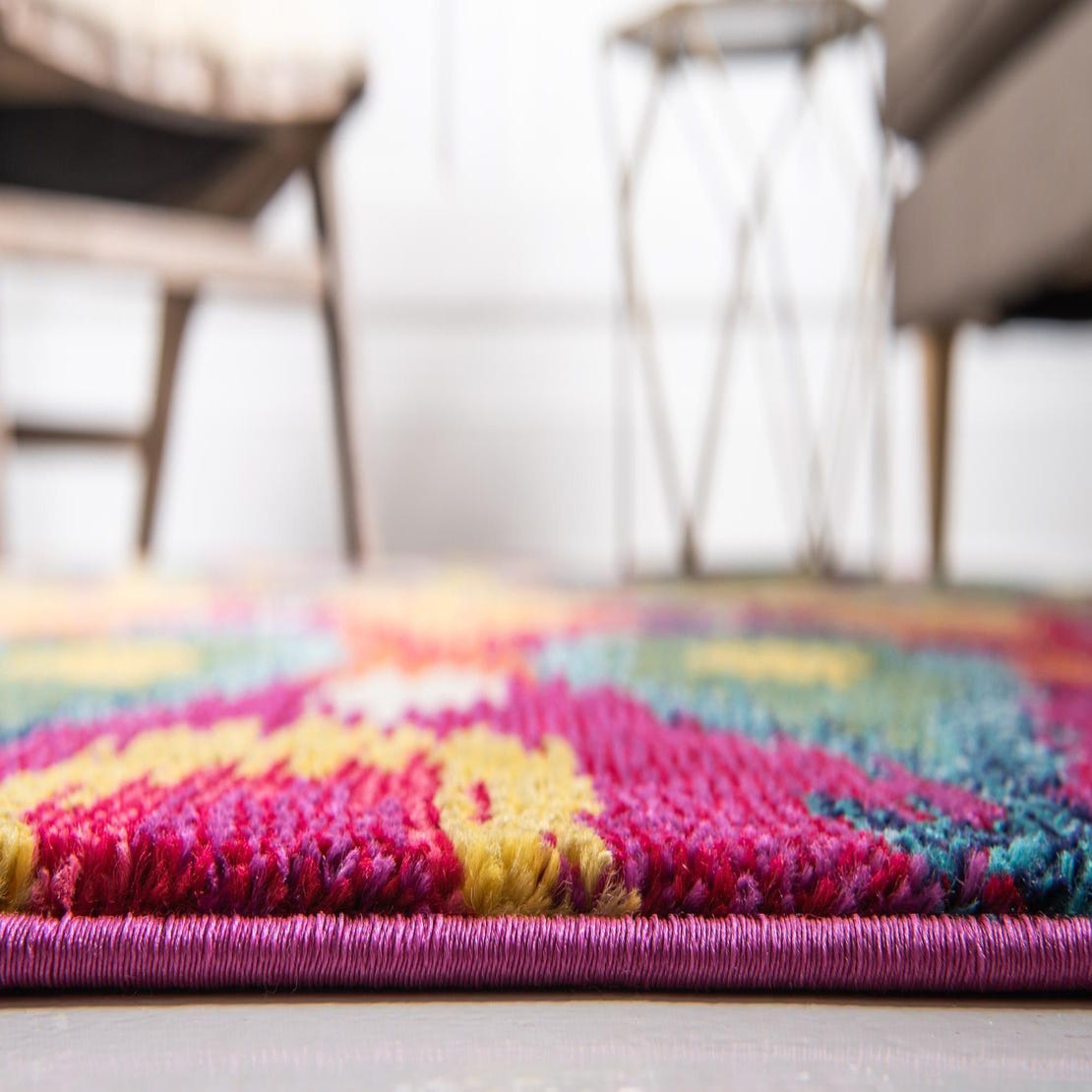 Was struck by the design and colors when I saw this online but the picture didn't do the rug justice: my husband was very skeptical until the rug arrived and we got it on the floor of our living room. The colors are rich and vibrant and the patterns goes beautifully with our eclectic cottage-y some-new/some-old decor. It seems to be quite stain-resistant (I spilled coffee on it the second day; it came right up.) And it feels great underfoot!
