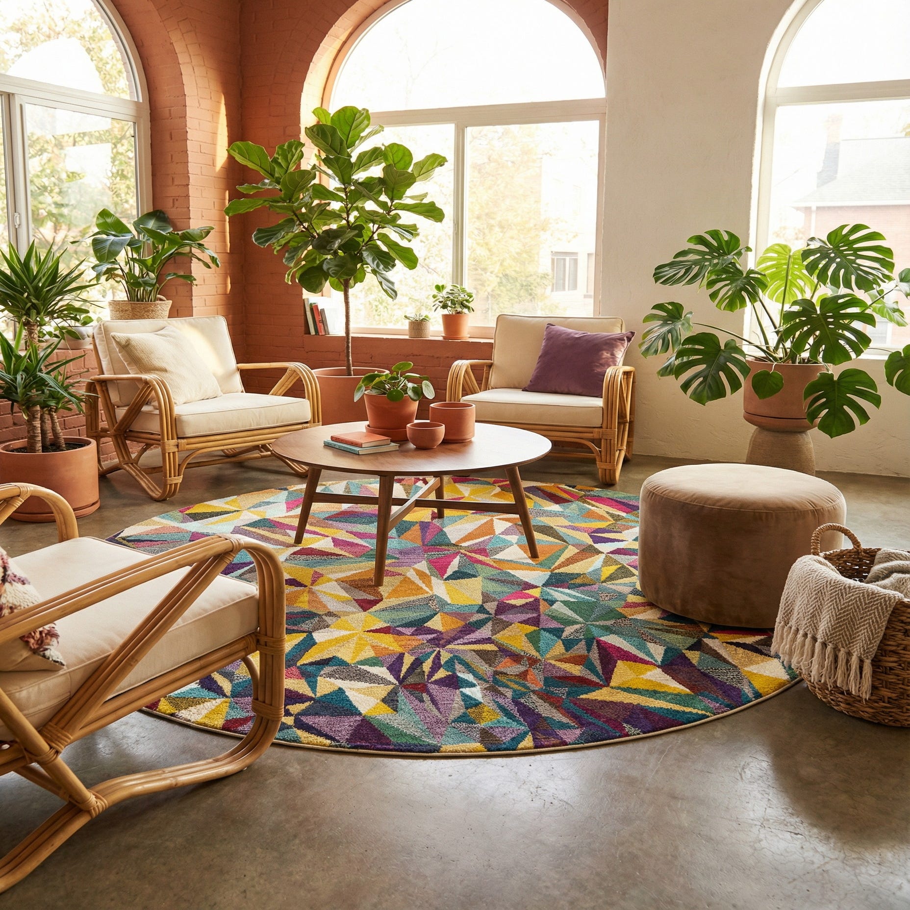 A vibrant, round accent rug with a faceted geometric pattern of interlocking triangles and shards that create a lively, mosaic-like field. The background is multi, punctuated by beige, blue, light blue, navy blue, burgundy, orange, puce, purple, red, yellow and pink that move across the surface in layered planes of color. Machine-made from 100% polypropylene, the rug has a short, even pile that feels smooth and slightly firm underfoot; the tightly tufted construction keeps the angular motifs well defined and gives the surface a tactile, structured hand when you run your fingers across it.