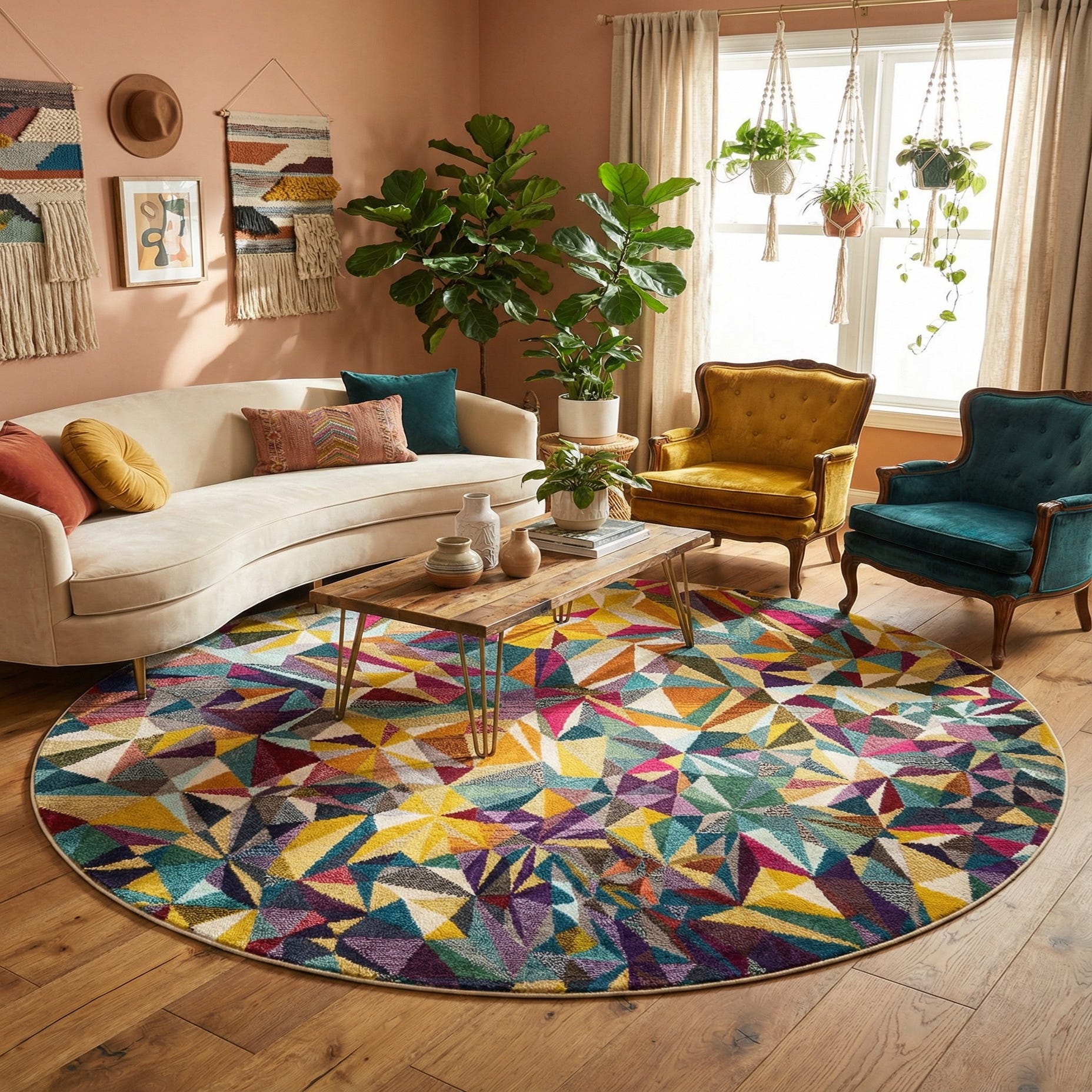 This piece works well wherever you want to introduce bold color and contemporary geometry. Use it beneath a round dining table to anchor a breakfast nook, place it in a modern living room to contrast with neutral sofas, or add it to a home office or study to bring energy to the floor. It also pairs nicely with mid-century furnishings, eclectic or bohemian layers, and natural wood tones—pull accent pillows or art from the rug’s navy, mustard, or burgundy tones to create a coordinated but lively scheme.
