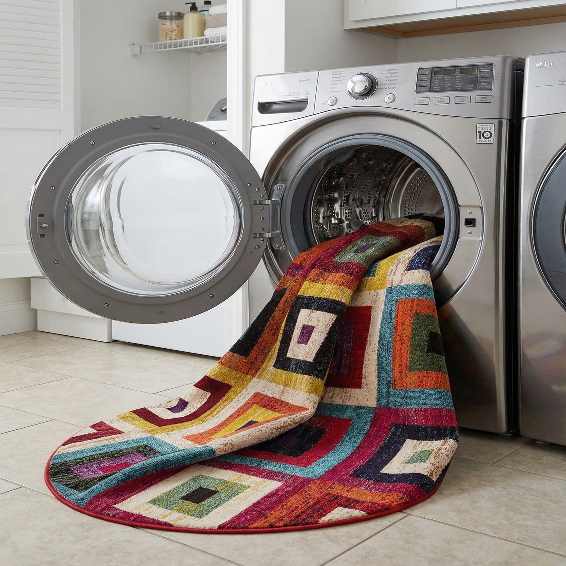 This rug works well as a focal point in a modern living room beneath a round coffee table or as a colorful anchor for a dining area with a circular table. It also fits an eclectic or bohemian scheme—pair it with warm wood tones, mixed textiles and metallic accents—or bring it into a home office or playroom to introduce pattern and energy without overwhelming the space. The mix of neutrals and vivid hues makes it easy to coordinate with ivory upholstery, navy or leather seating, and natural-finish furniture.