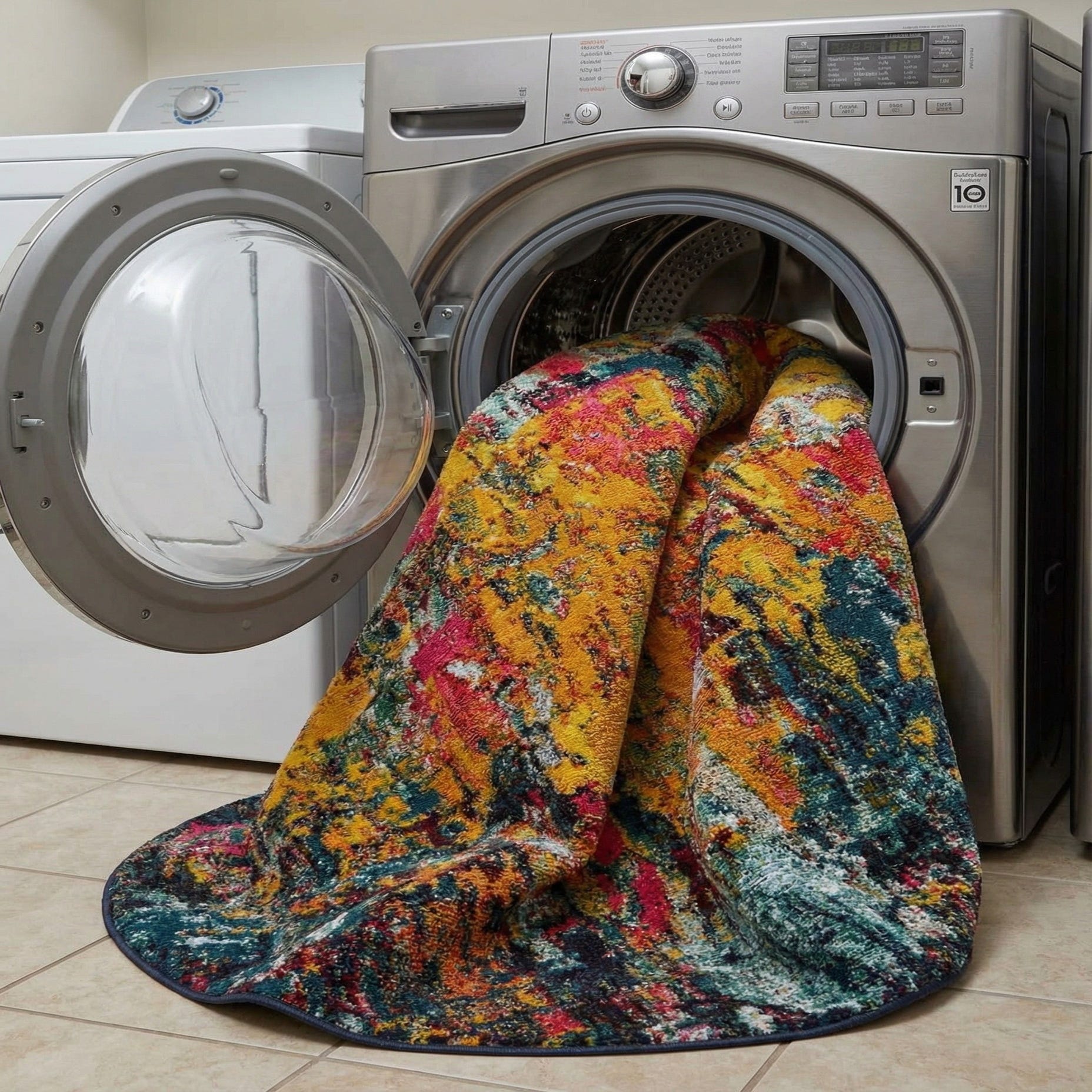 An abstract, painterly pattern brings a lively, layered look to this round rug. Patches of gold, orange, red and pink sit against deeper tones of navy, burgundy and blue with accents of light blue and green, all set on a multi-colored ground. The design reads like a modern art canvas—irregular, mottled shapes and subtle color shifts create depth without a strict repeat. Machine made from 100% polypropylene, the low, tightly tufted pile feels smooth and slightly cushioned underfoot while keeping the color definition crisp.