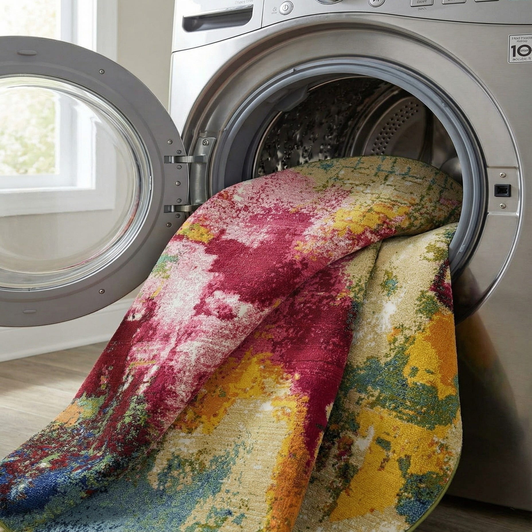 A vibrant 7' 10 round abstract rug with splashes of fuchsia, yellow, blue, and green, perfect for a modern indoor space.
