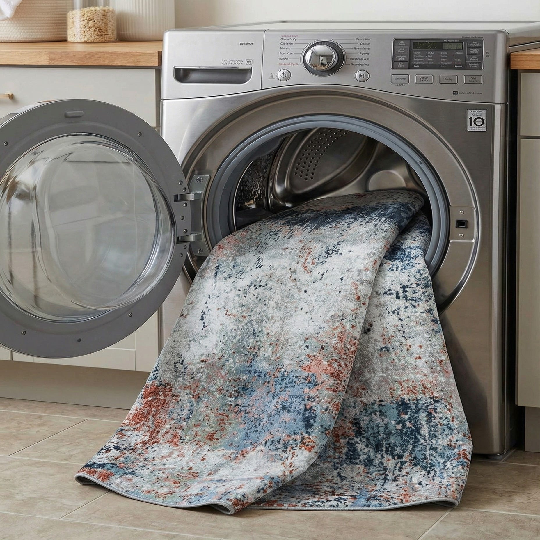 The texture is inviting, designed to withstand the high foot traffic of everyday living. This rug's stain-resistant and pet-friendly properties make it a practical choice for homes seeking effortless maintenance without compromising on style. The machine washable characteristic offers added convenience, especially for busy households.