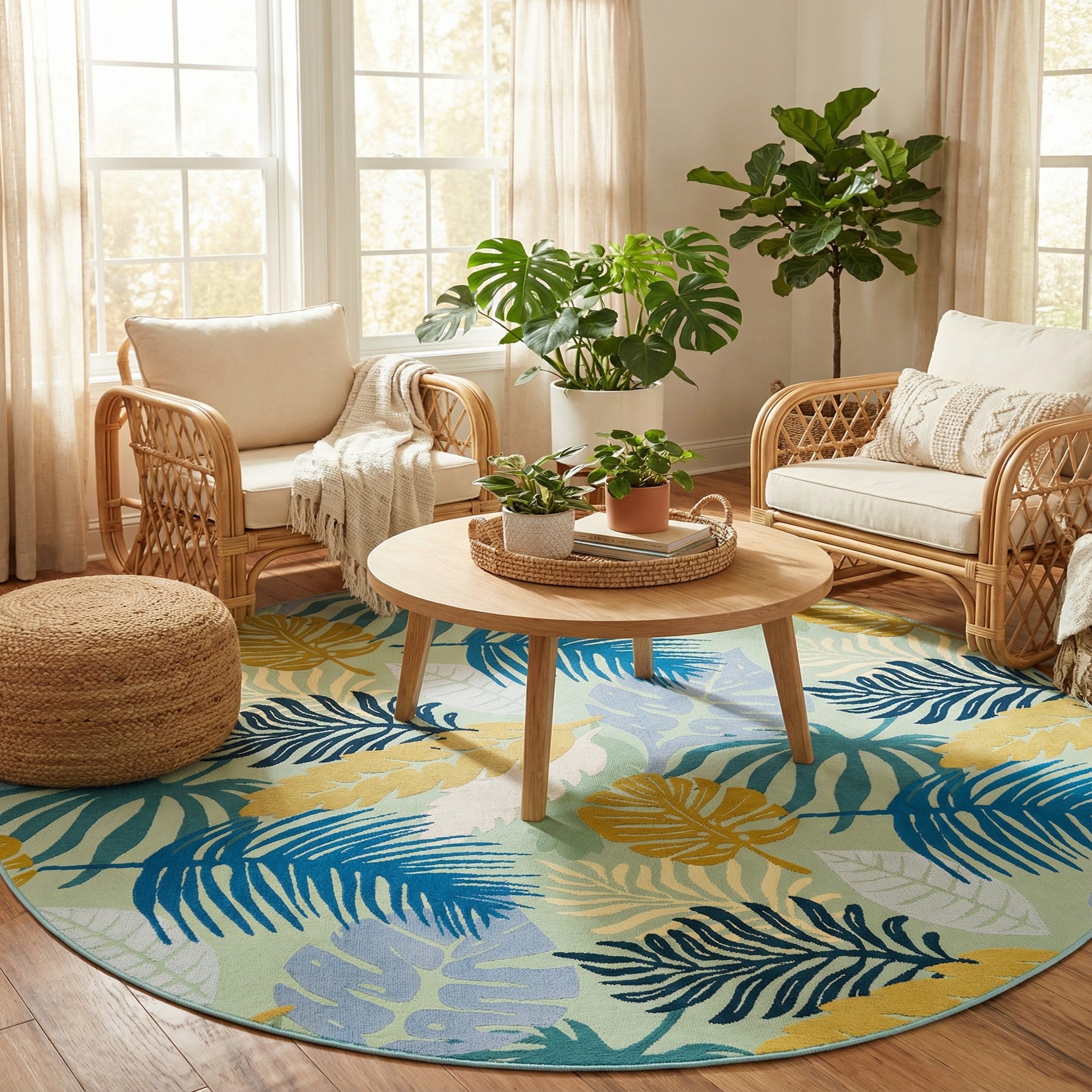 The Outdoor Botanical Collection presents an 8 Ft Round rug that offers a fusion of nature-inspired elements and modern design. This machine-woven piece is crafted from 100% polypropylene, ensuring a durable and easy-to-maintain surface, ideal for high-traffic areas and active households with pets. The flatweave construction results in a sleek profile that contributes to its versatile placement options.