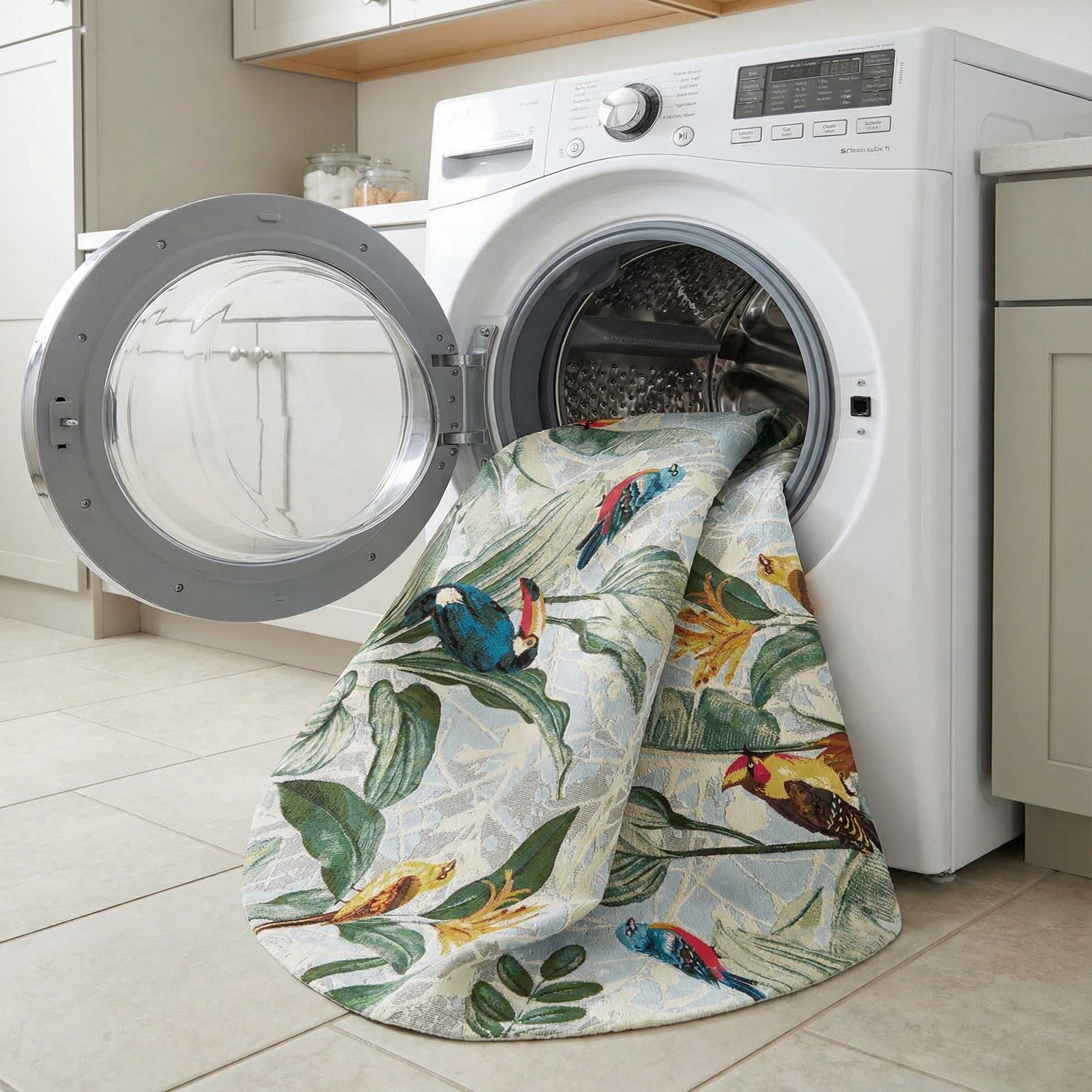 A round, multi-colored indoor/outdoor rug featuring a vibrant botanical pattern with tropical birds and lush green leaves on a light blue background.