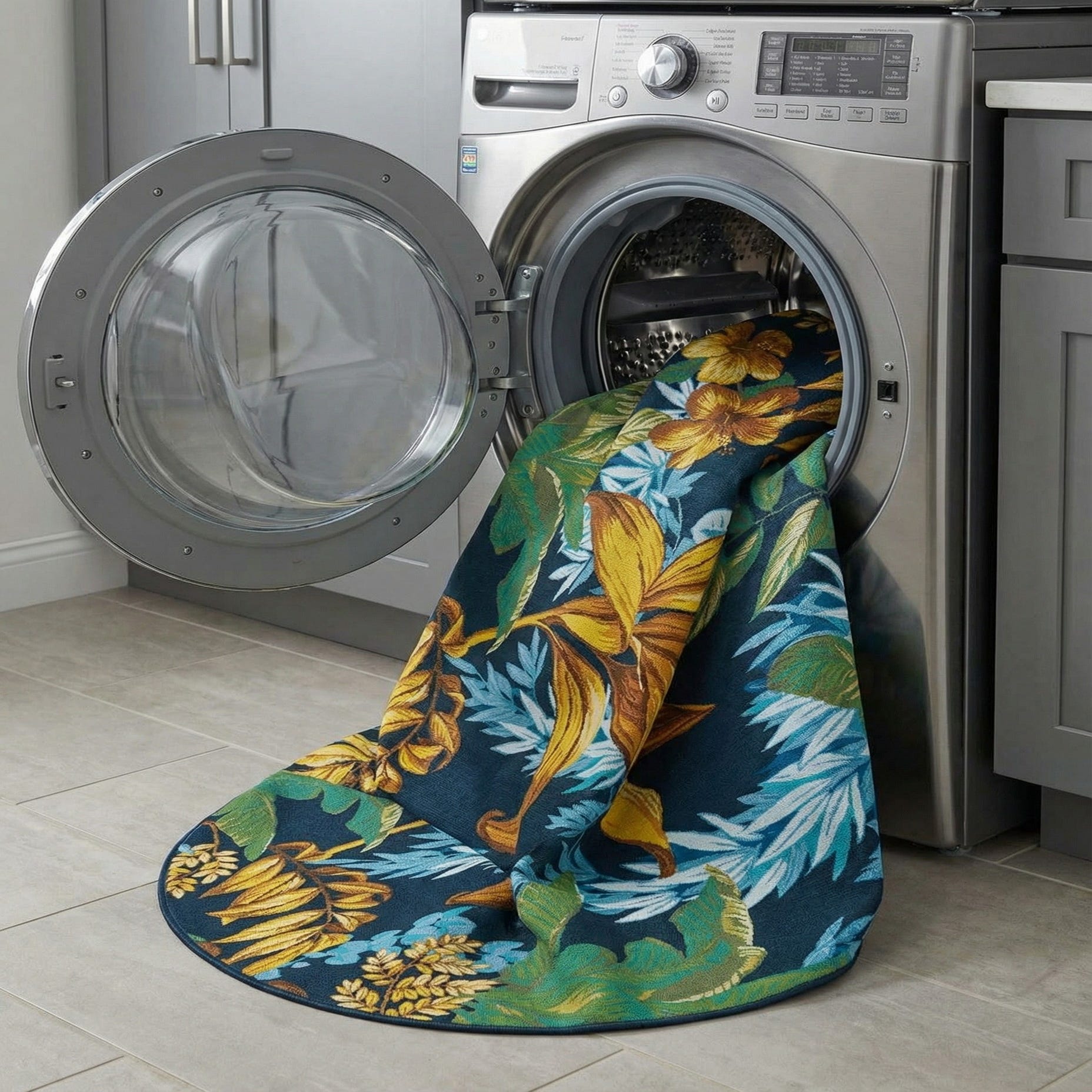 A round, multi-colored tropical rug with a dark blue background and vibrant yellow, green, and light blue botanical leaf and floral patterns.