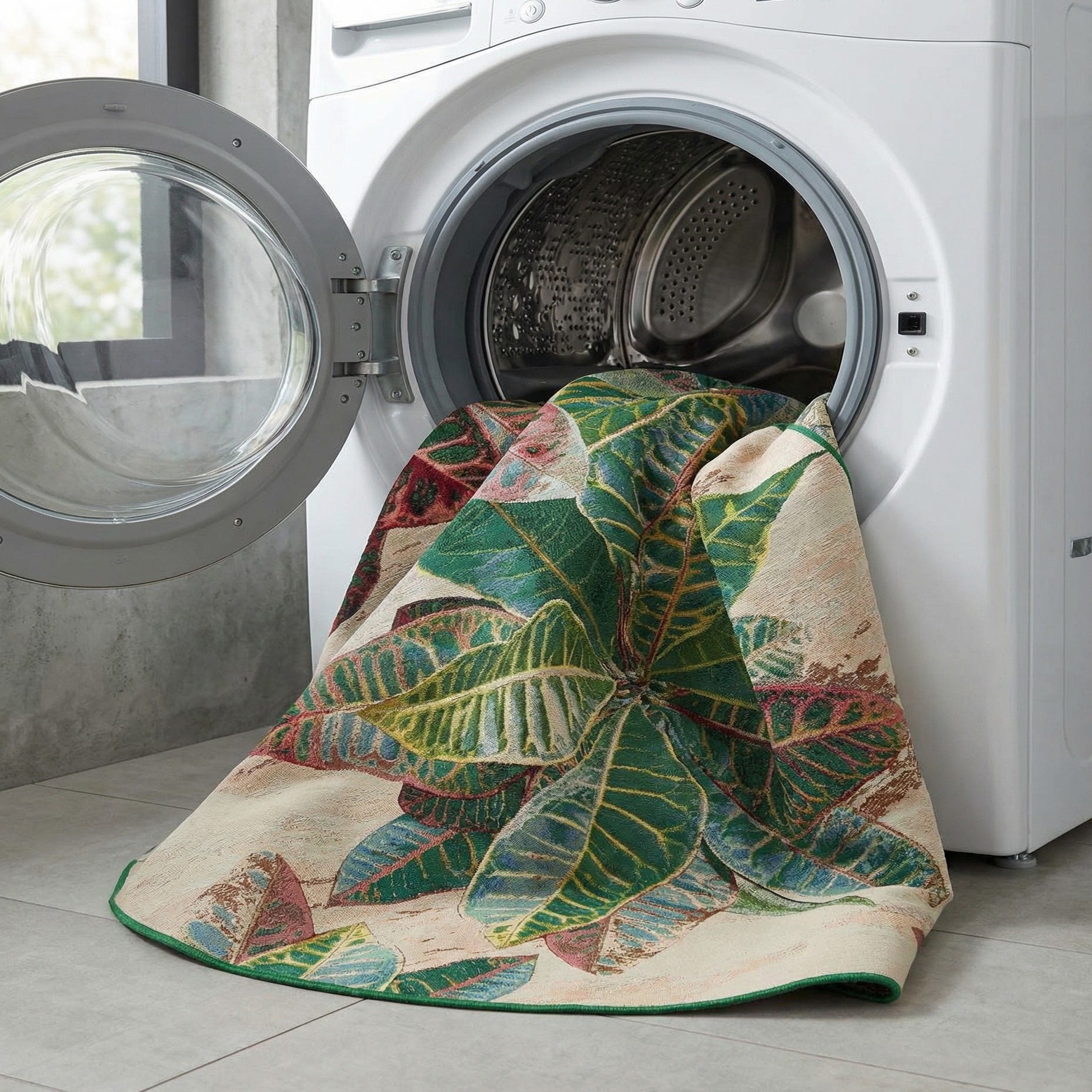 A lush botanical motif fills the round shape with layered, croton-like leaves rendered in a lively multi-background. Rich greens and teals take center stage, accented by burgundy, pink and red veins, soft touches of yellow, and ivory highlights that give the design depth and movement. The pattern has a painterly, slightly distressed backdrop that lets the foliage pop while keeping the overall look relaxed and natural. Machine made from 75% polypropylene and 25% polyester, the rug has a low-profile, tightly woven surface you can feel underfoot — mostly smooth with subtle textural variation where the design is woven into the pile.