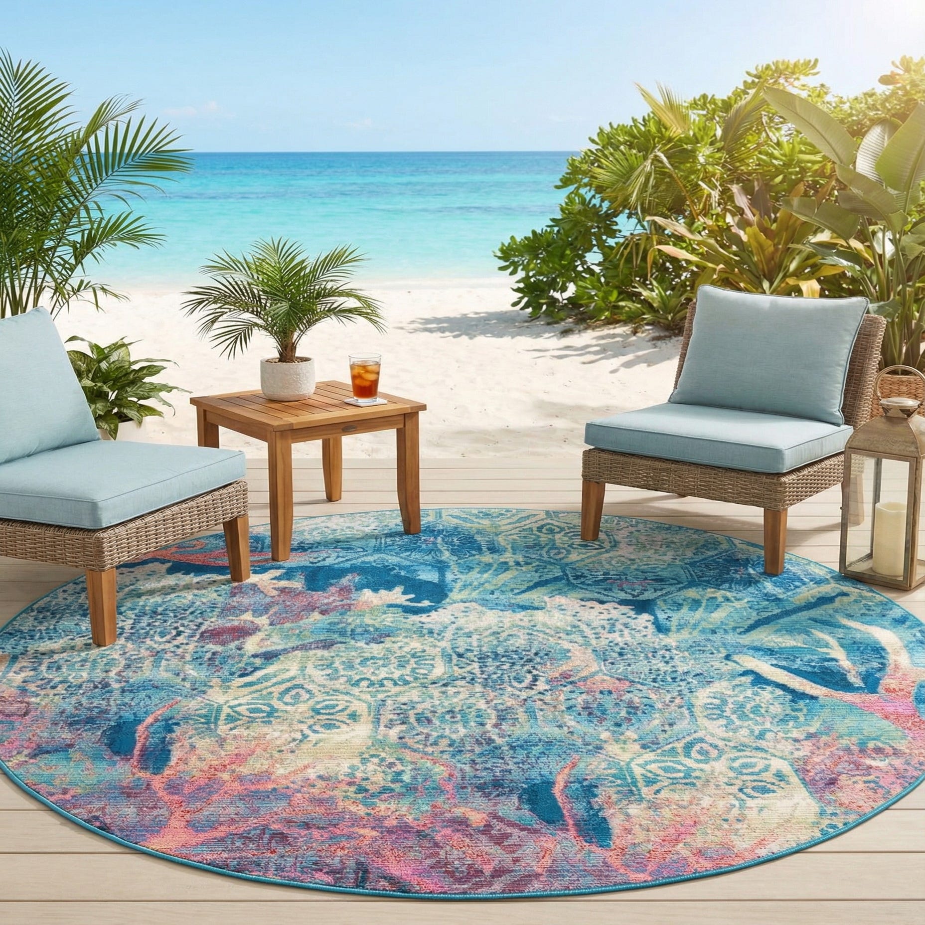 This rug would complement a variety of decor scenarios. Its resilient make-up and colorful design make it ideal for patio settings, sunrooms, or casual living areas where a splash of color and a hint of seaside charm are desired. The stylish, yet relaxed pattern pairs well with minimalist furniture to create a dynamic focal point, or it can be matched with nautical-themed decor for a cohesive look that celebrates coastal living.