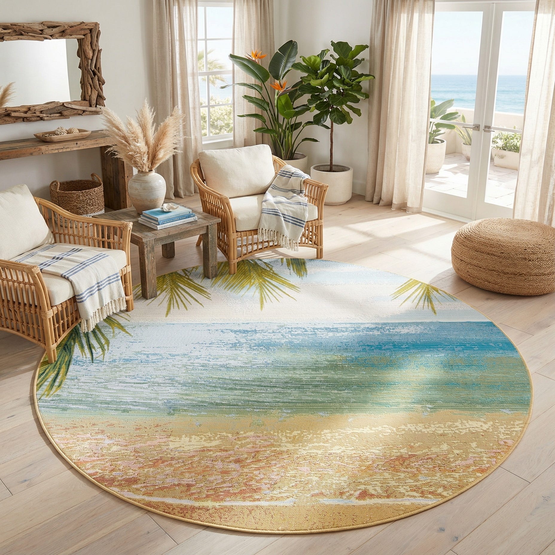 Machine-made of 100% polypropylene, the rug has a low, dense weave that feels smooth underfoot with a subtle texture where the pattern catches the light. Its round shape makes a welcoming anchor for a bistro set on a covered patio, a casual seating area on a screened porch, or a beach-inspired living room with rattan furniture, driftwood finishes and linen textiles. Use it to introduce color and a relaxed coastal mood without overpowering other layered textures in the space.