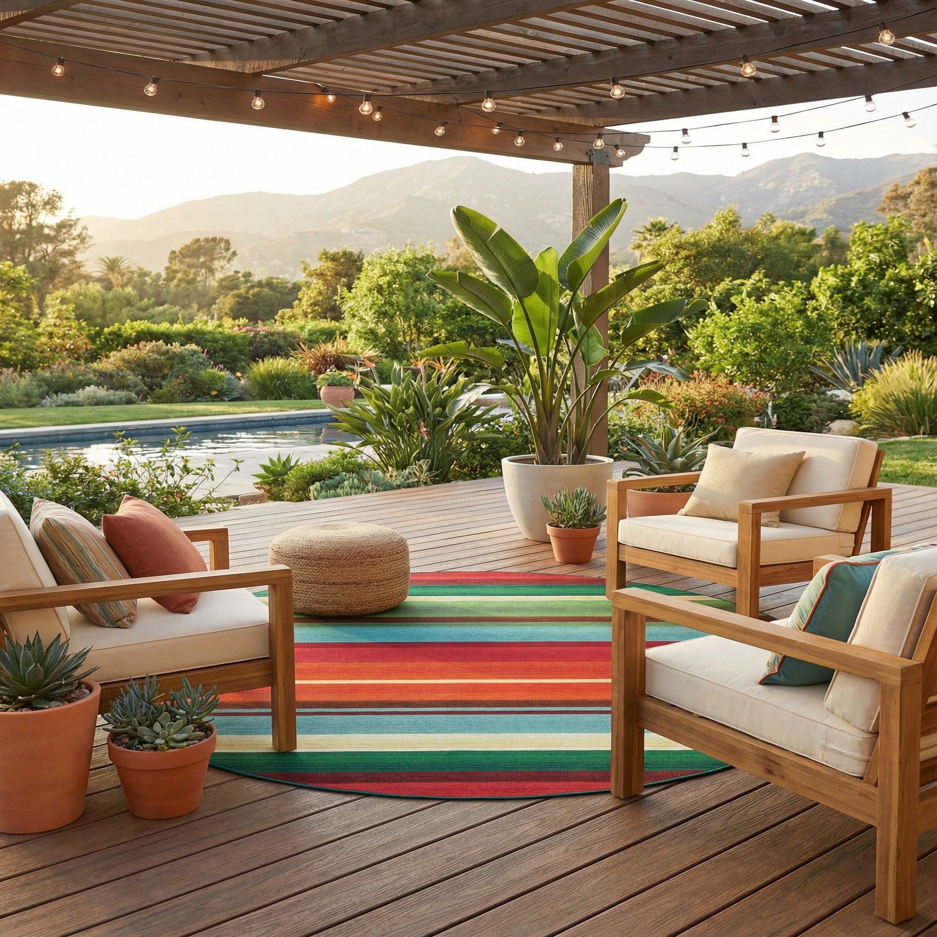 This Outdoor Modern Collection rug features a dynamic array of stripes, showcasing a vibrant color palette that includes beige, brown, burgundy, ivory, light blue, light green, maroon, olive, orange, red, rust red, with a multi-colored background that brings life to any space. The 8 Ft Round rug is machine woven of 100% polypropylene, boasting a flatweave construction that ensures durability while maintaining a smooth texture.
