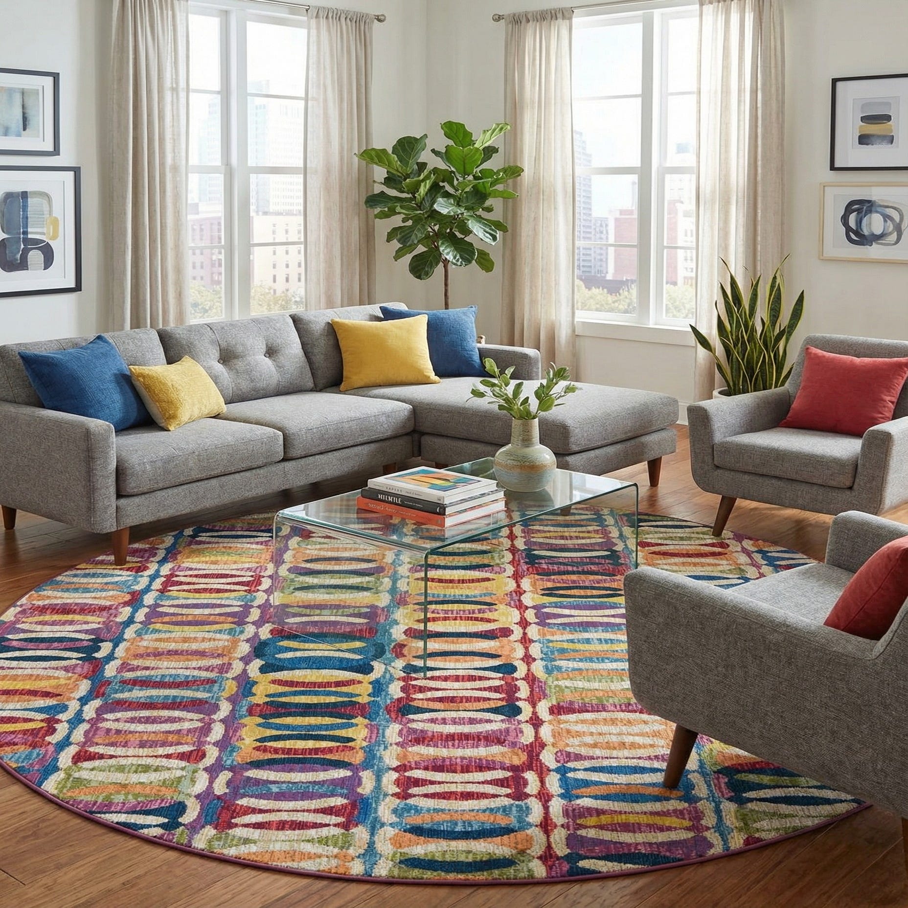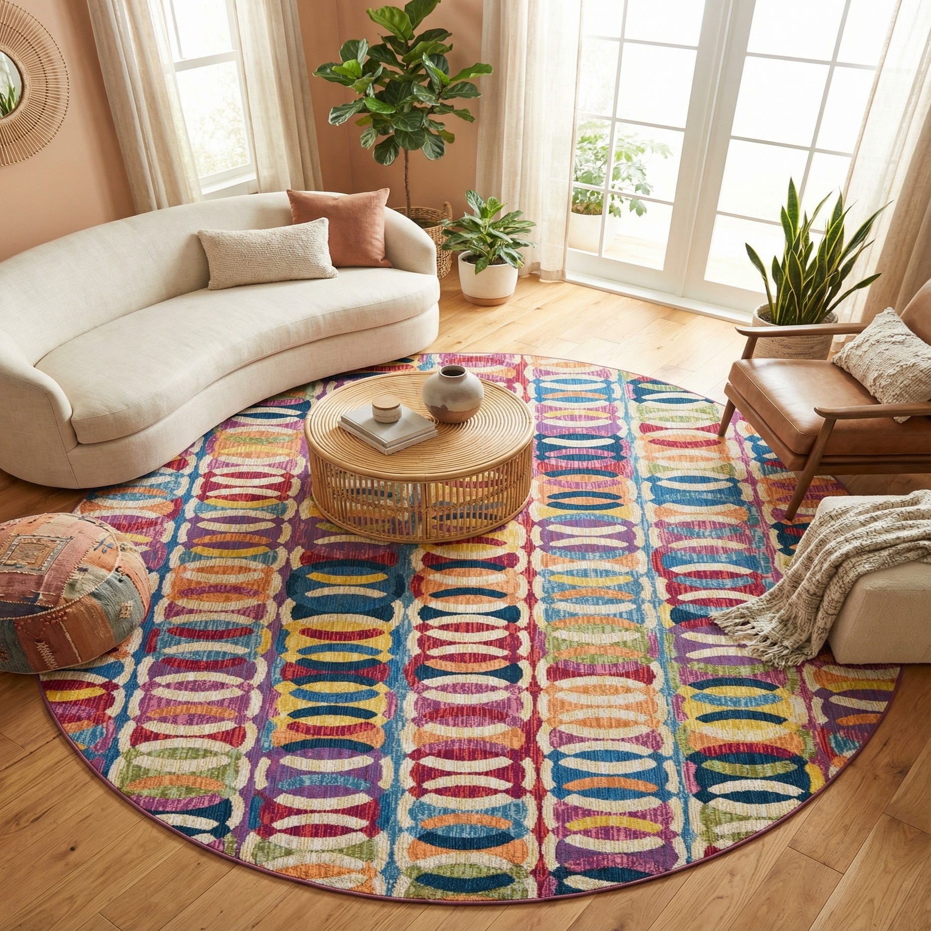A vibrant 7' 10 round multi-colored rug with a modern abstract interlocking oval pattern, suitable for a patio.
