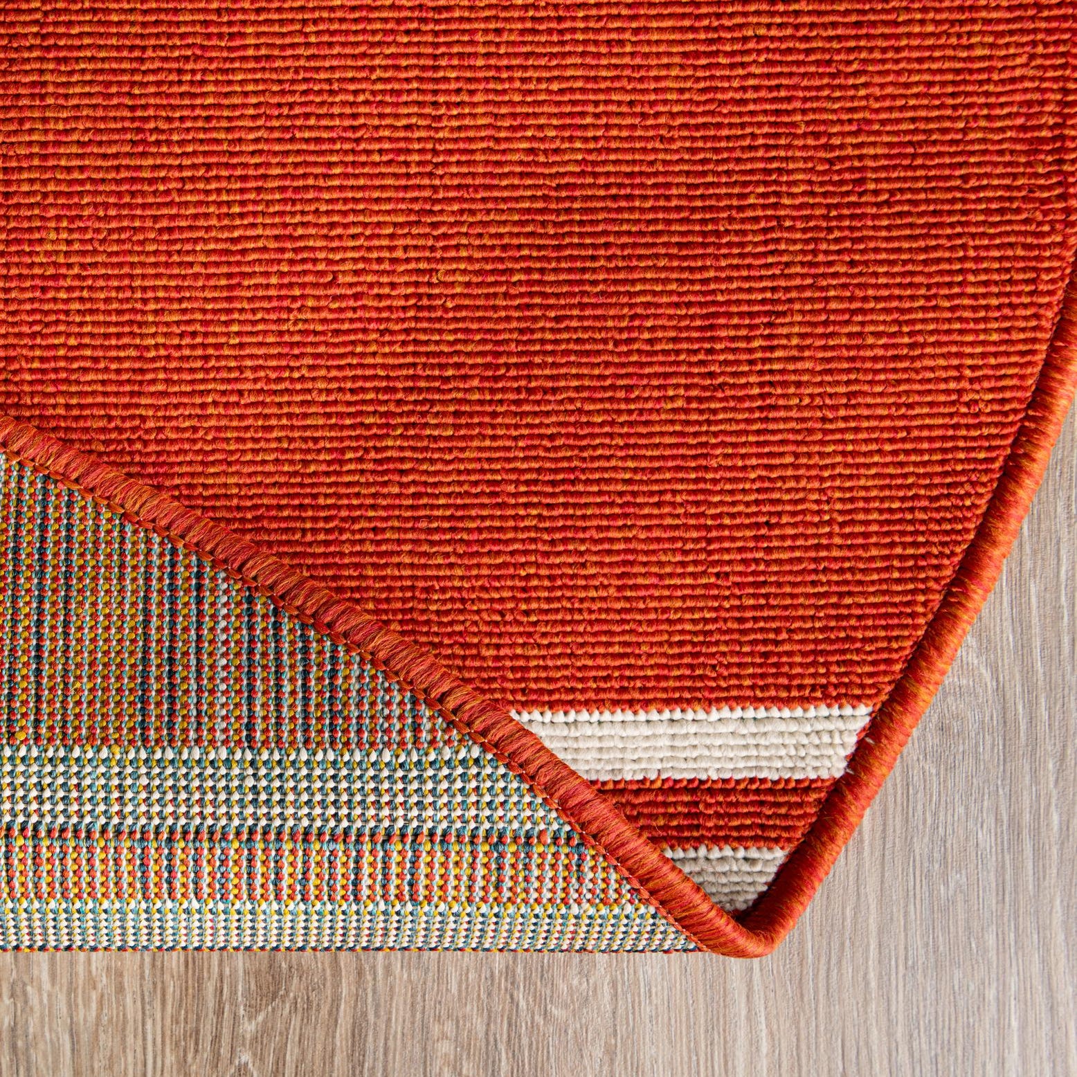 Machine-made from 100% polypropylene, the rug has a low-profile, flat-woven texture that sits close to the floor and offers a slightly firm, smooth hand underfoot. Its graphic color play works well beneath a circular dining set or centered under a coffee table to define a conversation area, and it’s an easy choice for a covered patio, sunroom, modern entryway, or a casual family room that welcomes bright, contemporary accents.