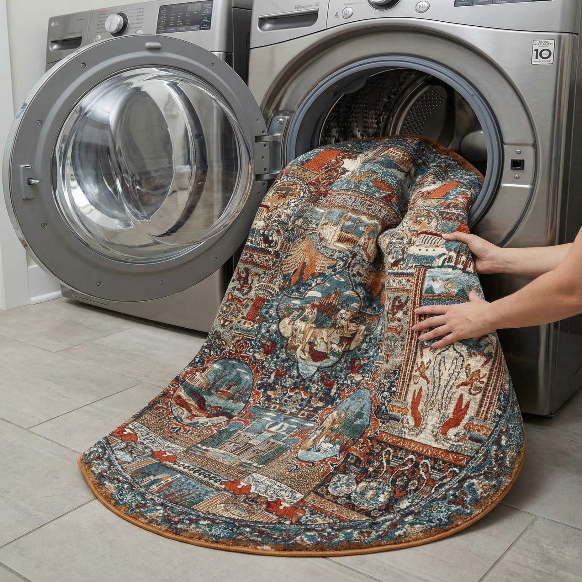 A 7' 10 round multi-colored traditional rug with intricate patterns, including architectural elements and animal figures, suitable for indoor or outdoor use.