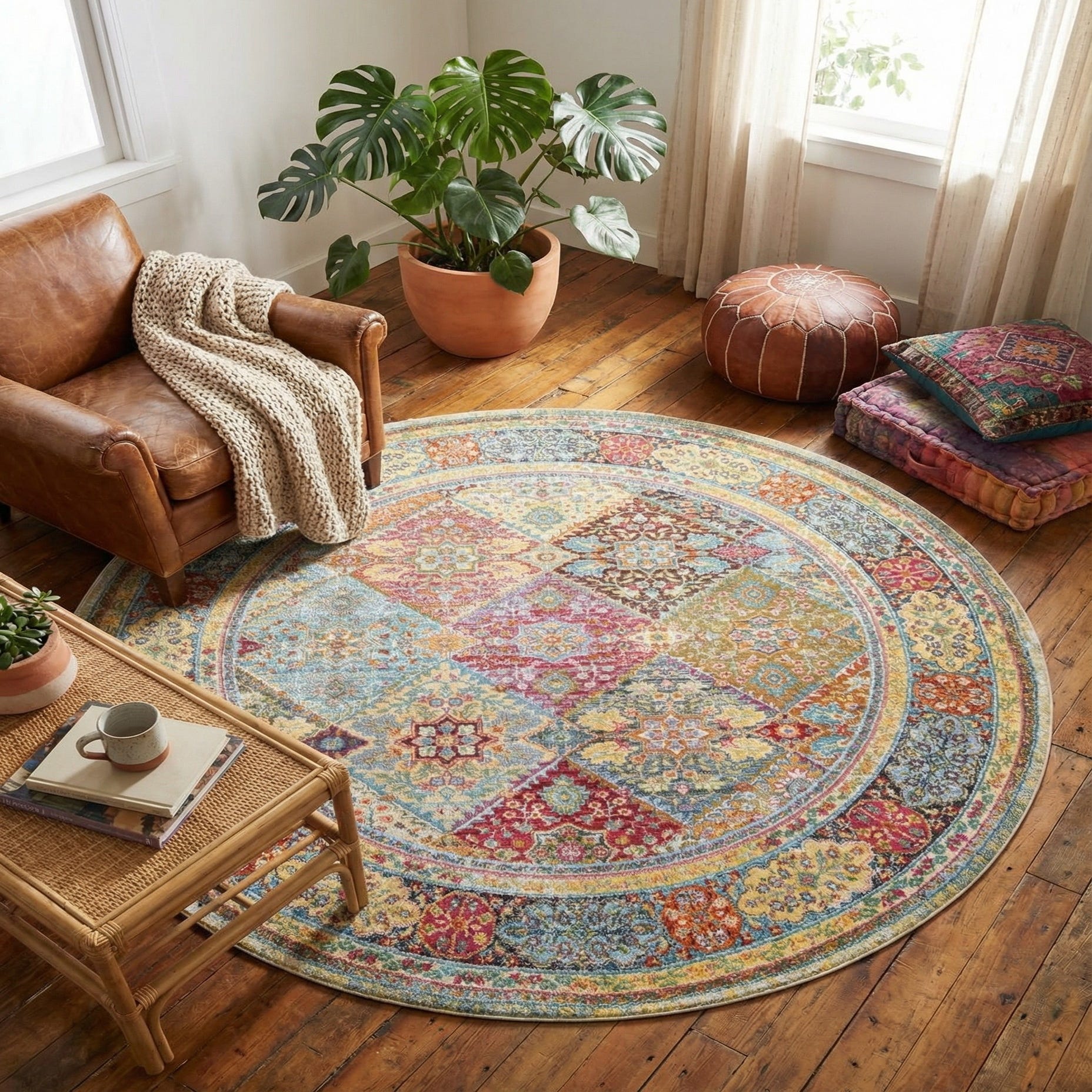 A round rug with a layered, patchwork-inspired medallion layout and an ornate circular border. The background is Multi, punctuated by beige, burgundy, gold, olive, red, pink and light blue that interweave across diamond-shaped motifs and floral details. The pattern has a slightly distressed, vintage-inspired look that balances warm tones like gold and burgundy with cooler blues and olives for a collected, global feel.