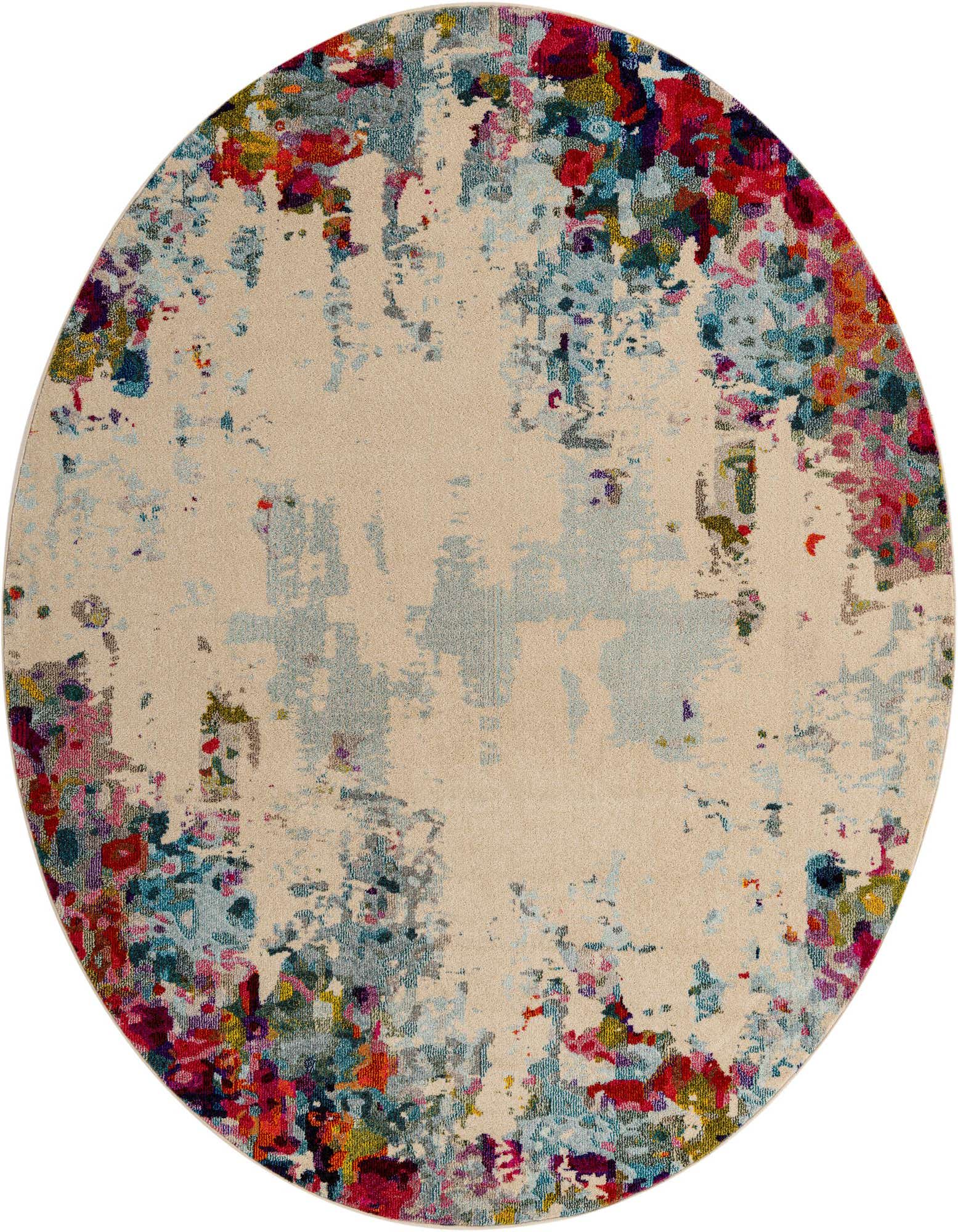 This versatile rug would be a suitable choice for various interior design scenarios, such as anchoring a casual sitting area, enhancing a modern living room, or adding a touch of color to a minimalist bedroom. Its round shape makes it an ideal centerpiece for spaces with round tables or to soften interiors dominated by straight lines and angles. Its artistic pattern can easily be a focal point in a room and complement a wide range of color schemes and decor styles, from contemporary to eclectic.