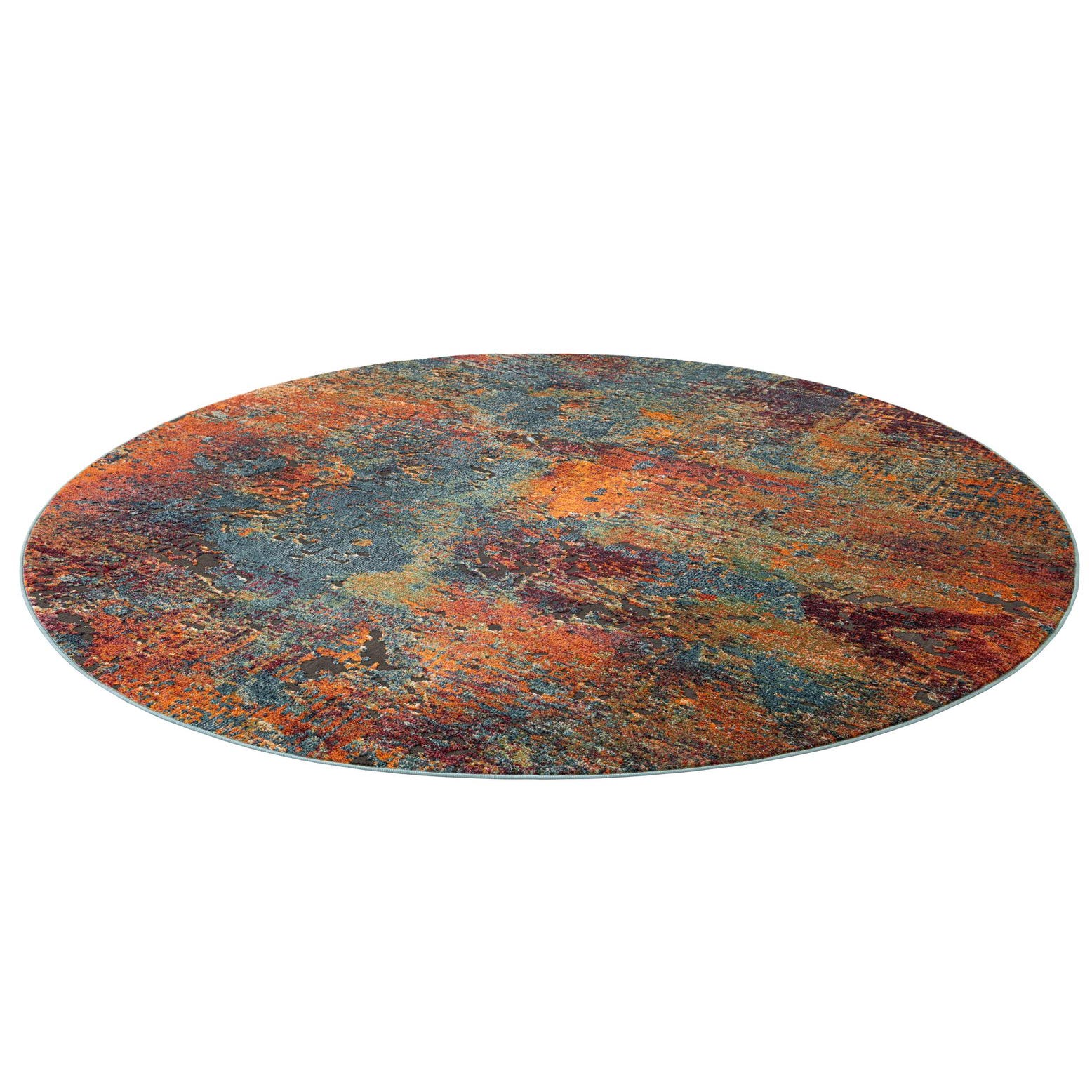A round, multi-colored rug with an abstract, distressed pattern in shades of rust orange, deep teal, and brown.