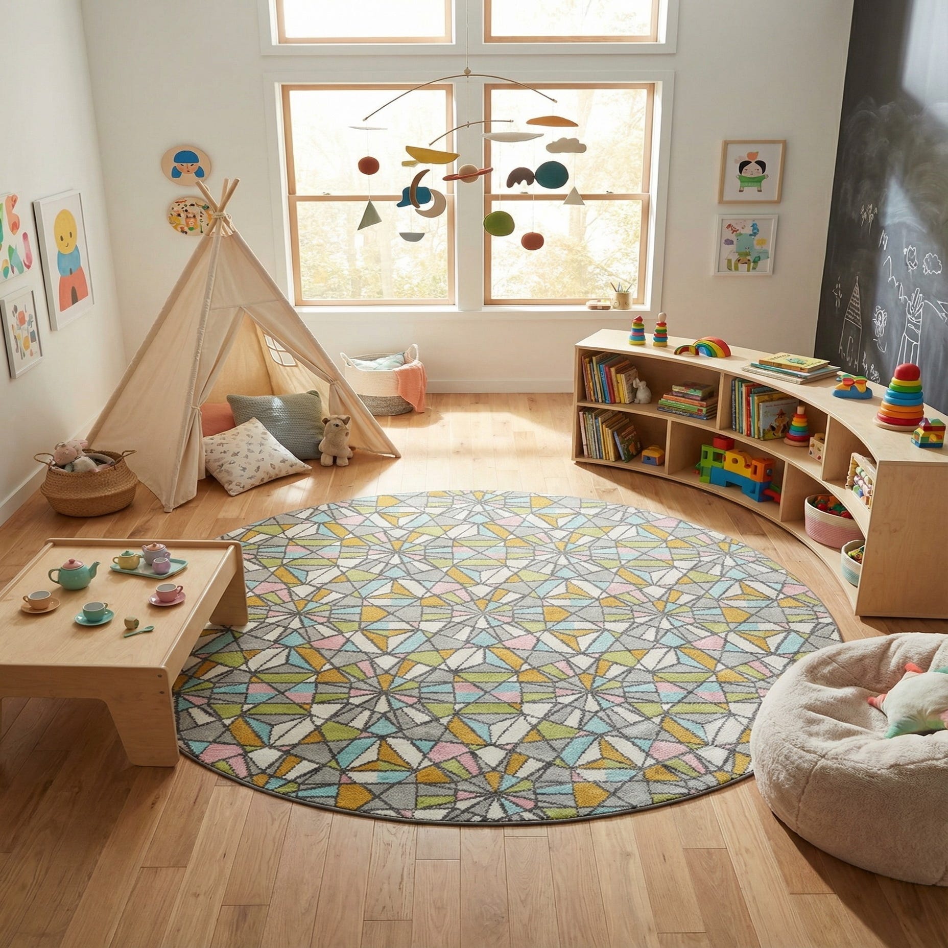 This piece would integrate seamlessly into a child's bedroom or playroom, infusing the space with a lively sense of imagination and color. Additionally, its round shape offers a harmonious balance, perfect for anchoring furniture arrangements in sitting areas or adding a touch of whimsy to reading nooks. Its versatile design can also be a bright accent in more neutral-themed rooms, offering a pop of color without overwhelming the existing interior elements.