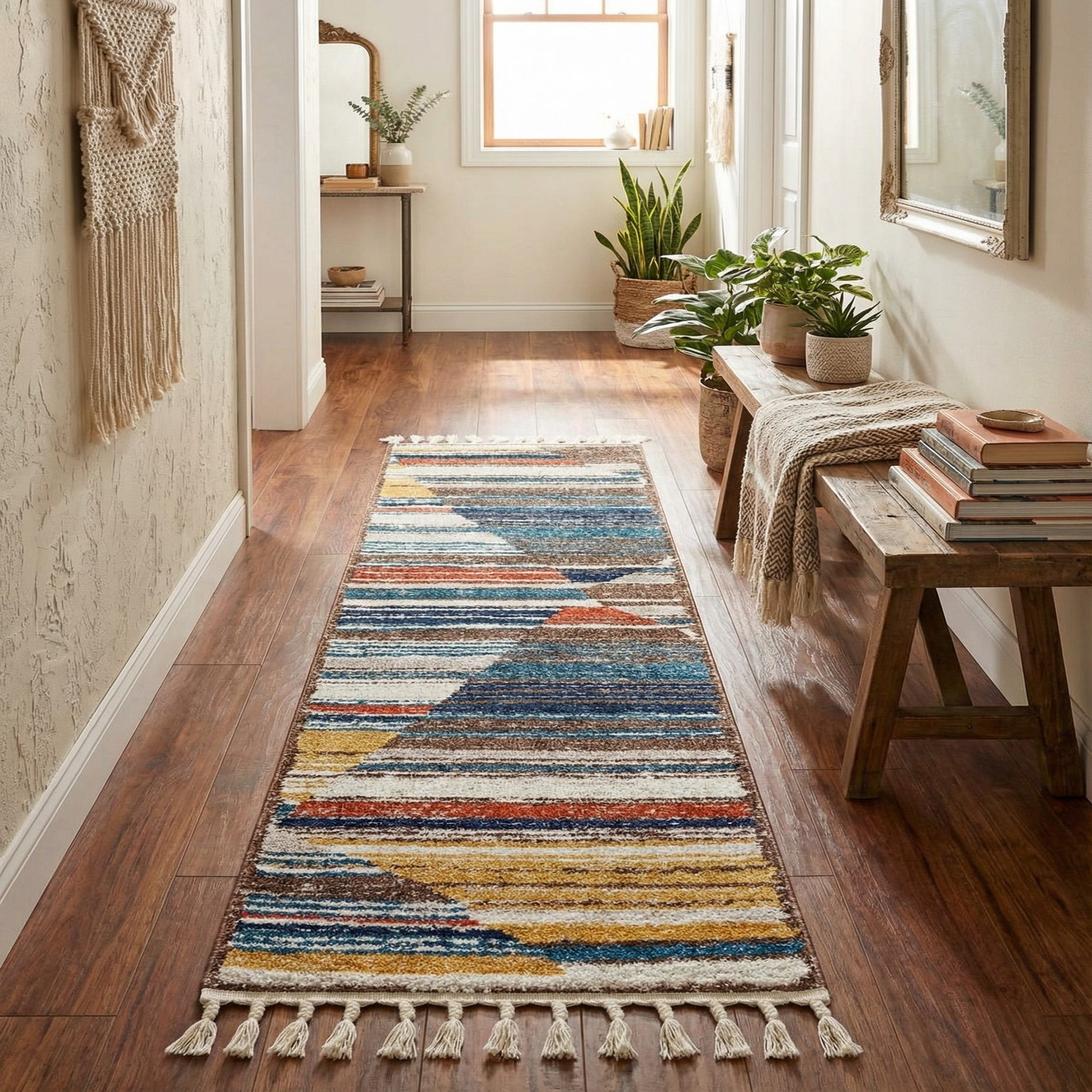 Machine-made from polypropylene, the rug has a soft, slightly plush pile with a subtle sheen that feels comfortable underfoot. The textured surface captures color variation and gives depth to the stripes, making the runner a strong visual anchor for narrow spaces. Best suited for hallways, entryways, kitchens or layered in front of a bed, it pairs well with light wood floors, navy or denim upholstery, warm leather accents, and eclectic or coastal-inspired decor.