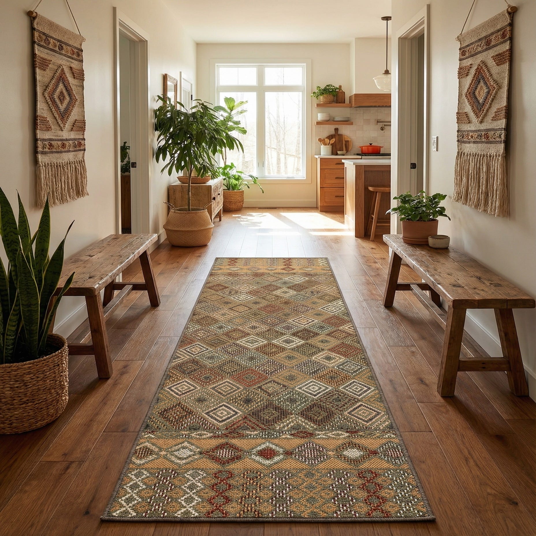 Use this runner to add pattern and color to narrow spaces and high-traffic routes: an entry hall, a kitchen aisle, or a covered porch. It pairs particularly well with natural wood tones, woven rattan or wicker, and neutral upholstery, and it complements casual, coastal, farmhouse, or modern-rustic interiors that benefit from layered pattern without added pile. The balanced mix of neutrals and deeper accents makes it easy to anchor a space or to introduce a quiet pop of color.