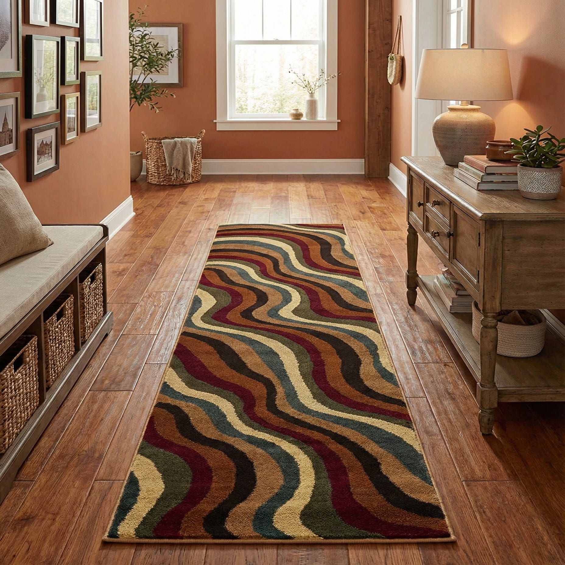 Place this runner in a hallway or entry to define circulation, alongside a bed to add warmth to the bedside, or in a narrow kitchen aisle for a splash of pattern. It pairs naturally with warm wood floors and leather or mid-century furnishings, and it also complements eclectic or contemporary interiors that use mixed textures and rich accent colors. Use it to anchor seating arrangements or to introduce a vintage-inspired color story without overwhelming the room.