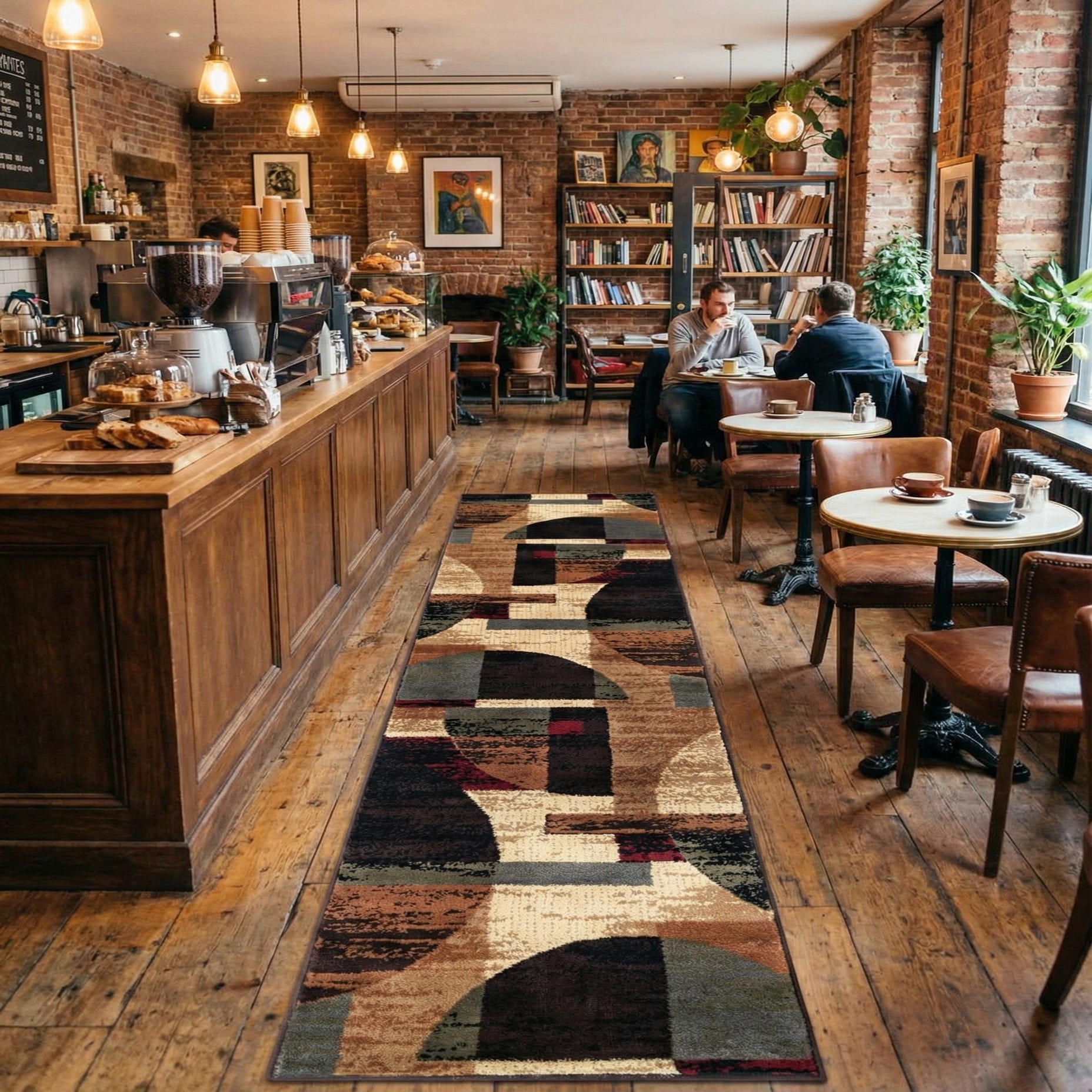 Machine-made from 100% polypropylene, the rug has a low-to-medium pile with a slightly textured surface and a subtle, resilient hand underfoot. It works well in narrow spaces where you want color and pattern to lead the eye — think hallways, entryways, and kitchen runners — and pairs nicely with warm wood floors, leather or mid-century furniture, and neutral walls. Use it to anchor a long corridor, add interest to a transitional foyer, or soften an industrial-style entry with layered textiles and simple furnishings.
