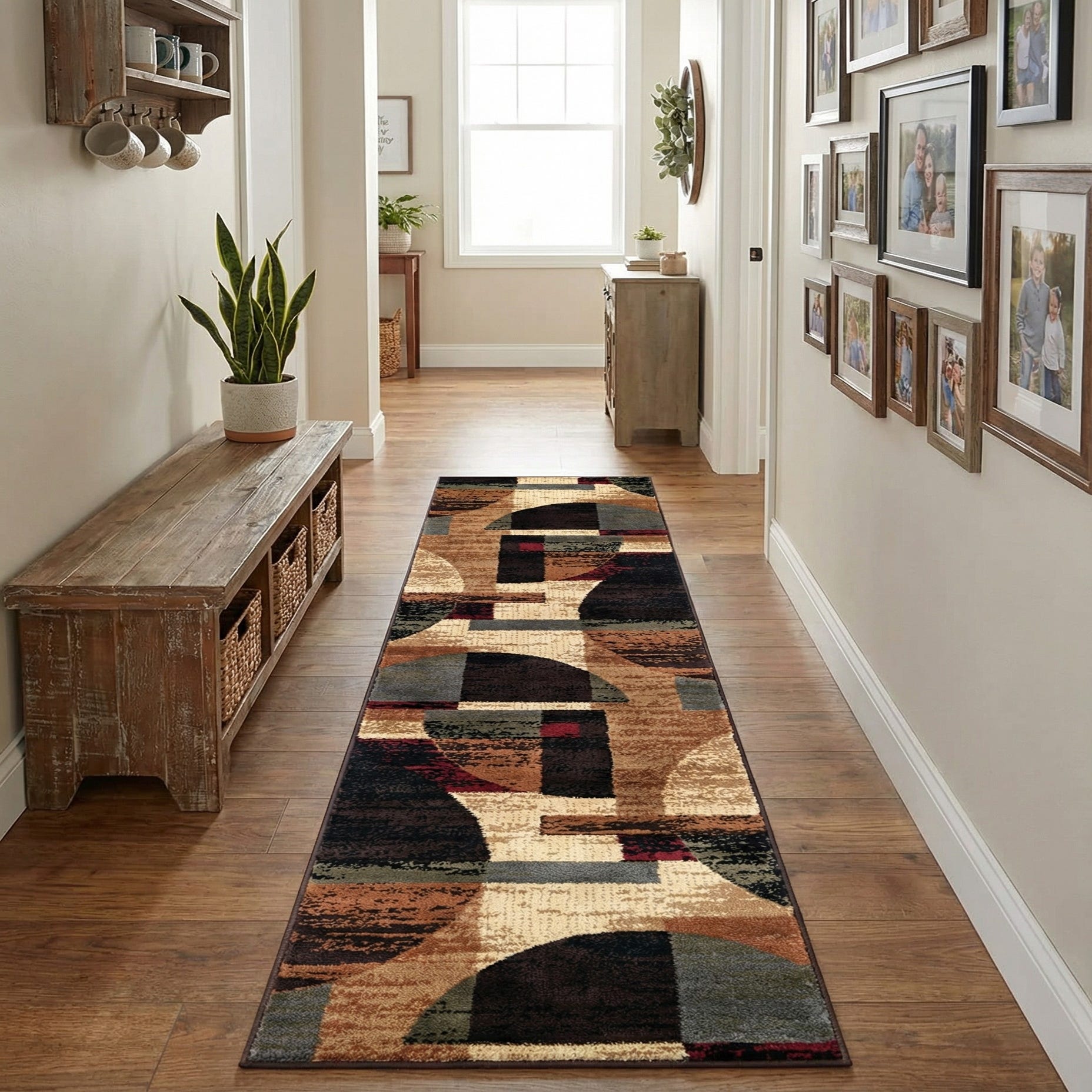 A multi-colored modern runner rug with abstract stripes and geometric shapes in shades of brown, black, cream, grey, and red, ideal for a hallway or kitchen.