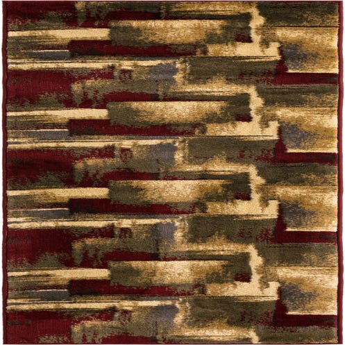 An abstract composition of overlapping blocks and painterly brushstrokes gives this runner a layered, contemporary look. The multi background supports warm beige and brown planes with rich burgundy, olive and gray accents, plus touches of black and blue that add depth and contrast. The edges of each shape are softened by a distressed, faded effect that creates movement across the length of the rug.