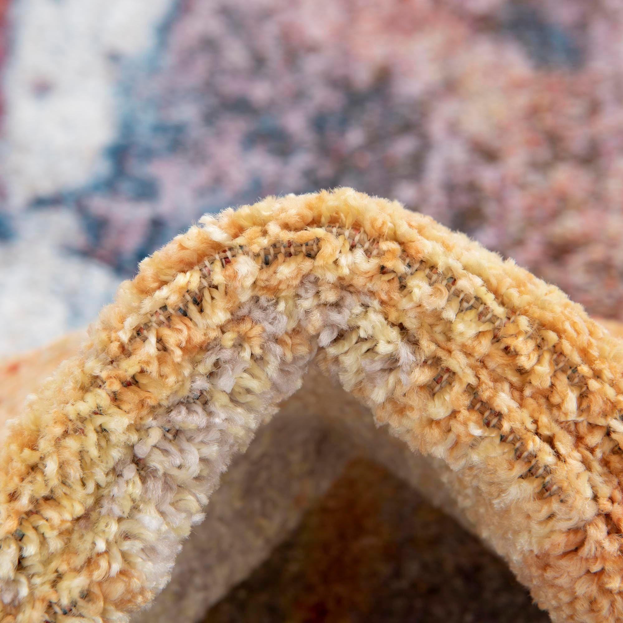A painterly abstract pattern washes across a multi-hued background, where warm splashes of orange, peach and rust red mingle with cooler accents of blue and violet. Cream and ivory areas lift the composition while specks of brown and pink add depth and contrast. Machine made of 100% polyester with space-dyed yarn, the rug has a softly textured surface and a subtle sheen that highlights the variegated color shifts and gives the pile a slightly brushed, tactile feel.