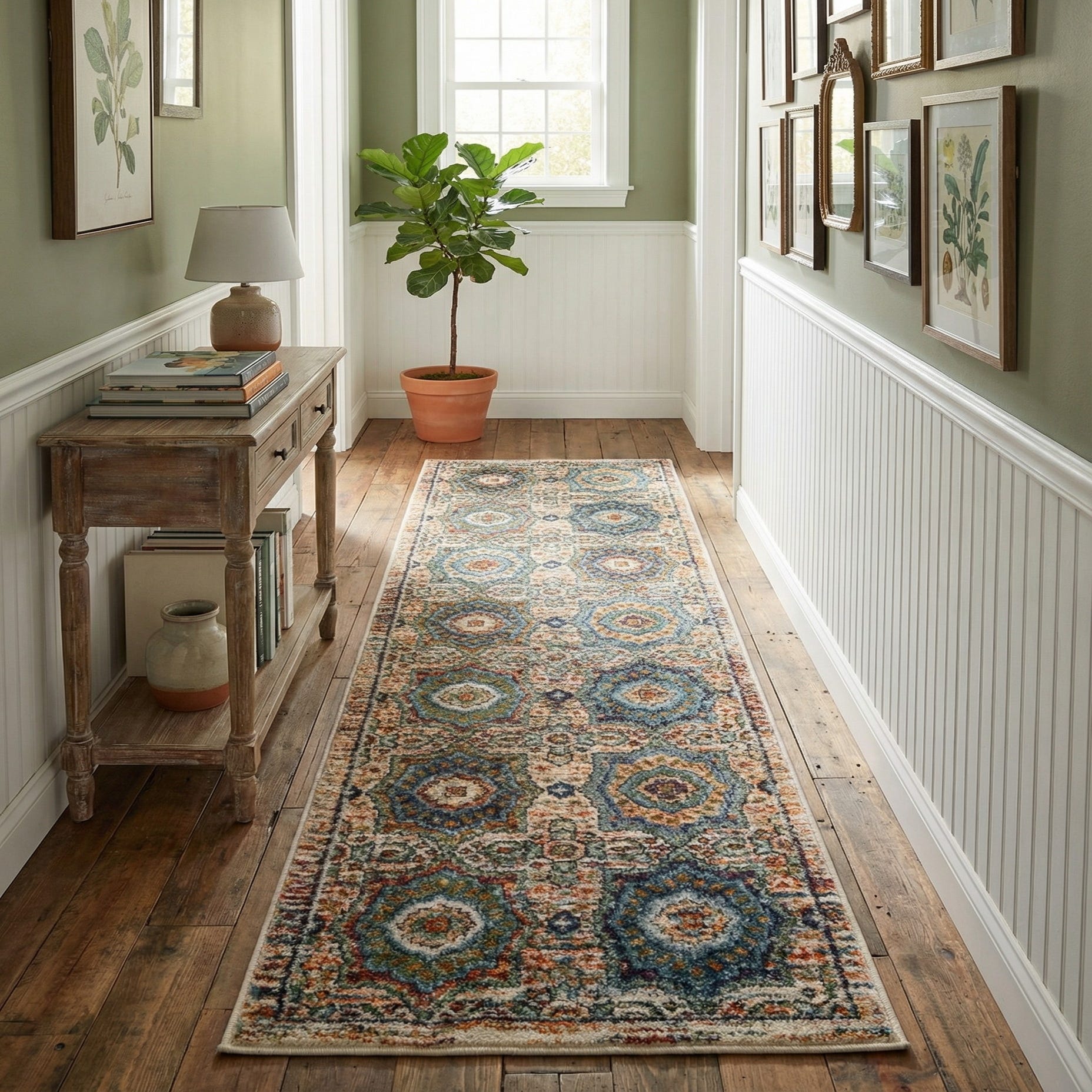 A multi-colored 8 ft runner rug with a distressed traditional medallion pattern in blues, oranges, and creams.