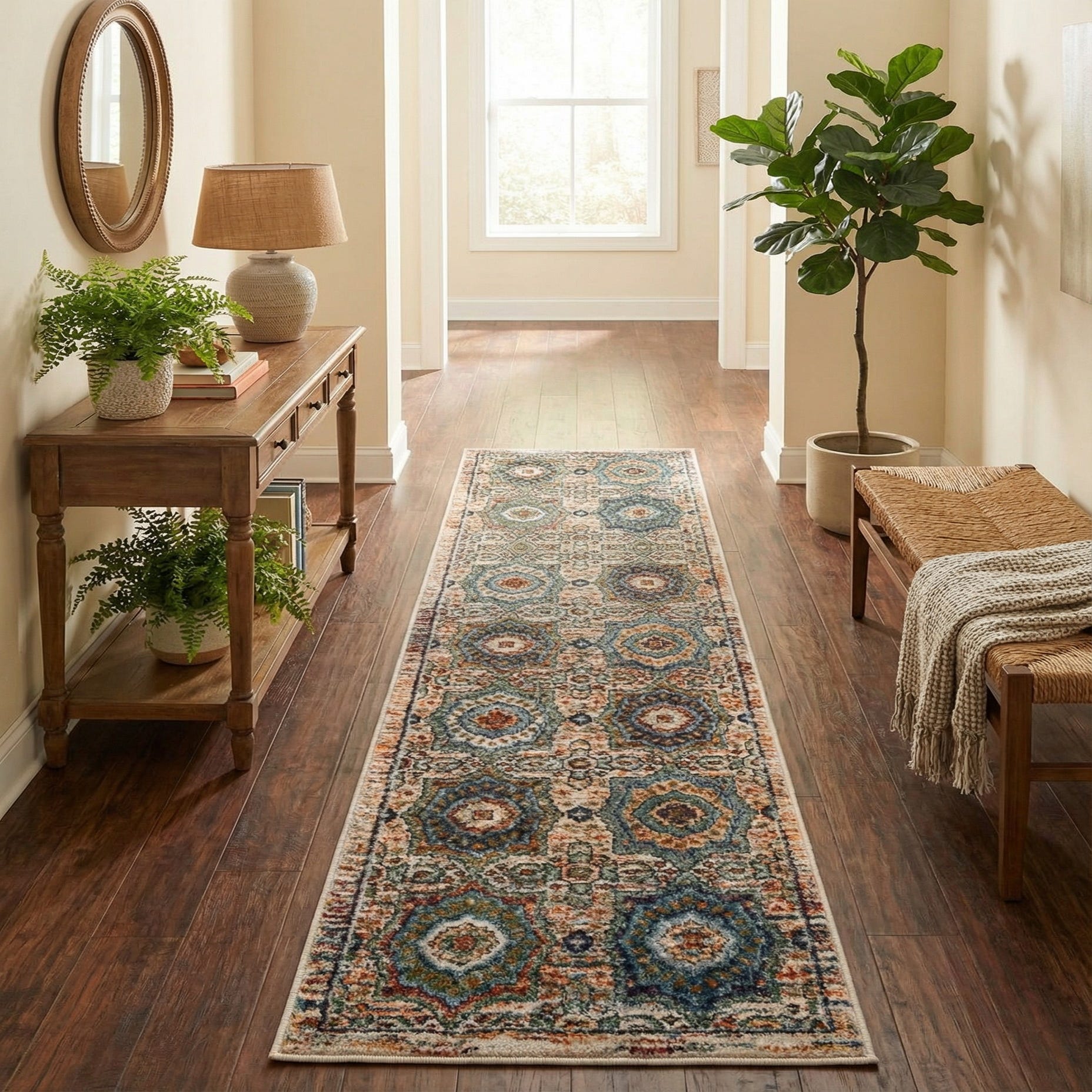 Primary color is Multi. Colors in this rug include: Multi, Beige, Black, Blue, Green, Ivory, Light Blue, Navy Blue, Orange, Peach, Purple, Red.