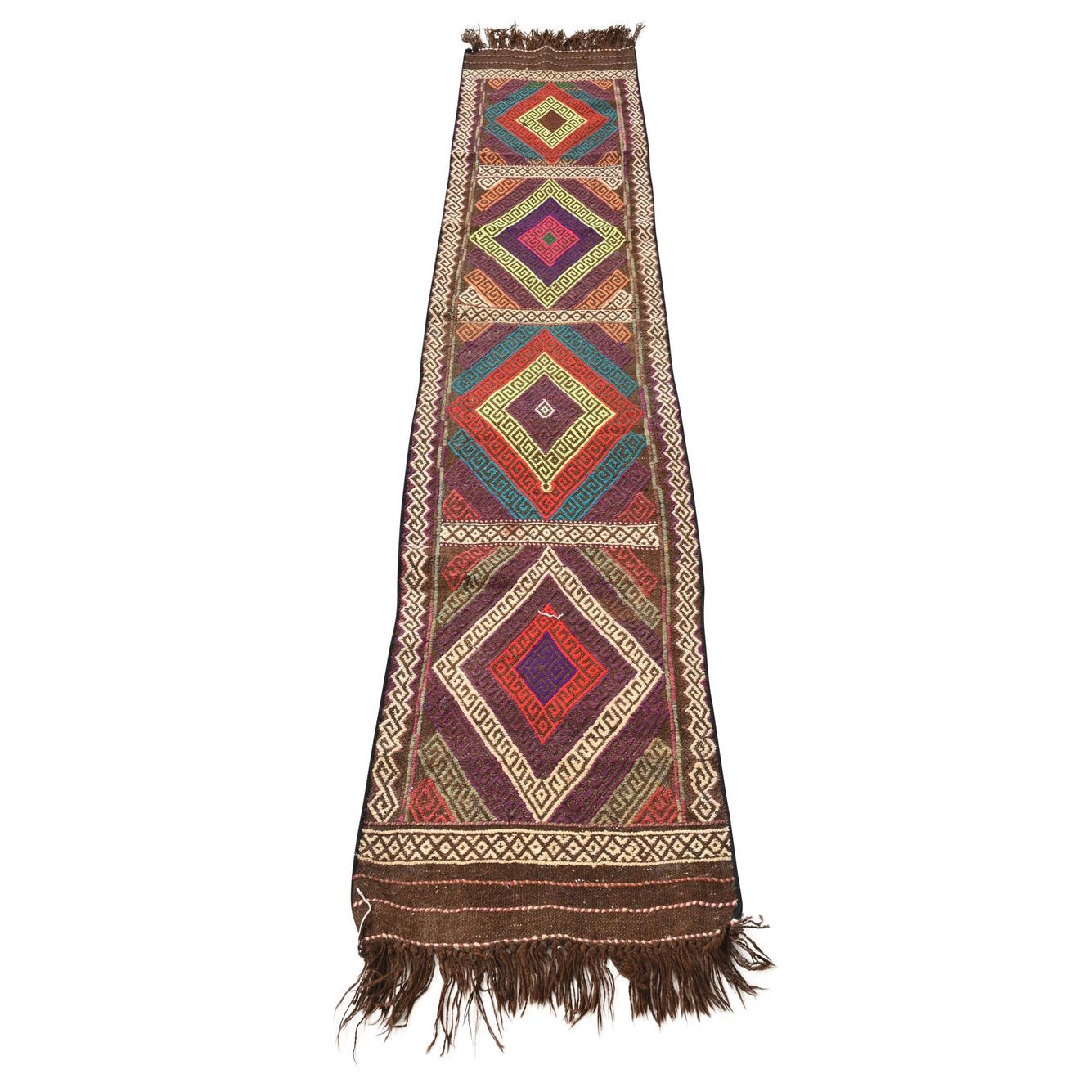 A vibrant 8 ft multi-colored Kilim Fars wool runner rug with tribal geometric patterns and fringe, ideal for a hallway or kitchen.