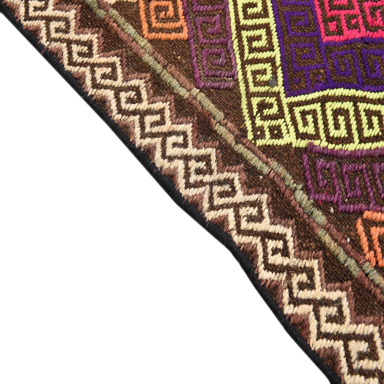 The Kilim Fars Hand Woven 100% Wool 8 Ft Runner presents a vibrant mélange of colors that create a tapestry of intricate patterns and cultural heritage. The primary multi-colored background sets the stage for a dynamic array of geometric motifs in shades of beige, black, brown, gray, green, ivory, purple, red, tan, teal, and yellow. This runner features a densely hand-woven texture, indicative of traditional kilim craftsmanship.