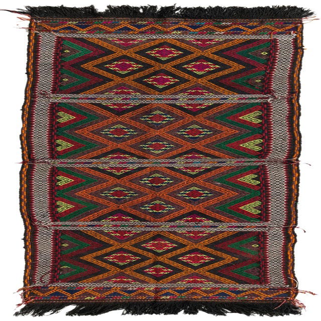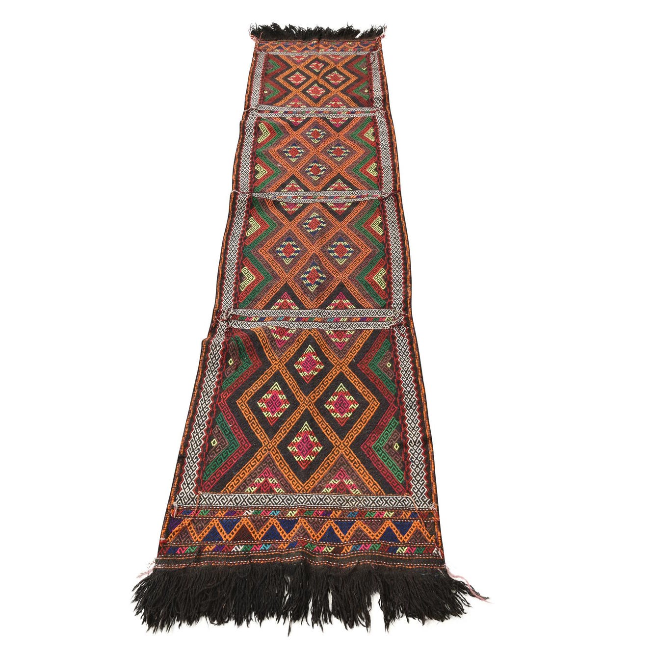 A vibrant 8 ft runner rug from the Kilim Fars collection, featuring a multi-colored Persian tribal pattern with geometric diamonds and fringe.