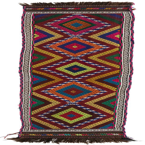 Hand-knotted of 100% wool, this runner displays a bold geometric kilim pattern of stacked diamond medallions and stepped chevrons. The background is multi, punctuated by vivid bands of green, orange, red, yellow and pink that form concentric diamonds, while an ivory meander border frames the field. The wool pile sits low and firm underhand, offering a naturally textured, slightly tactile surface with short fringe at each end that completes the handcrafted look.