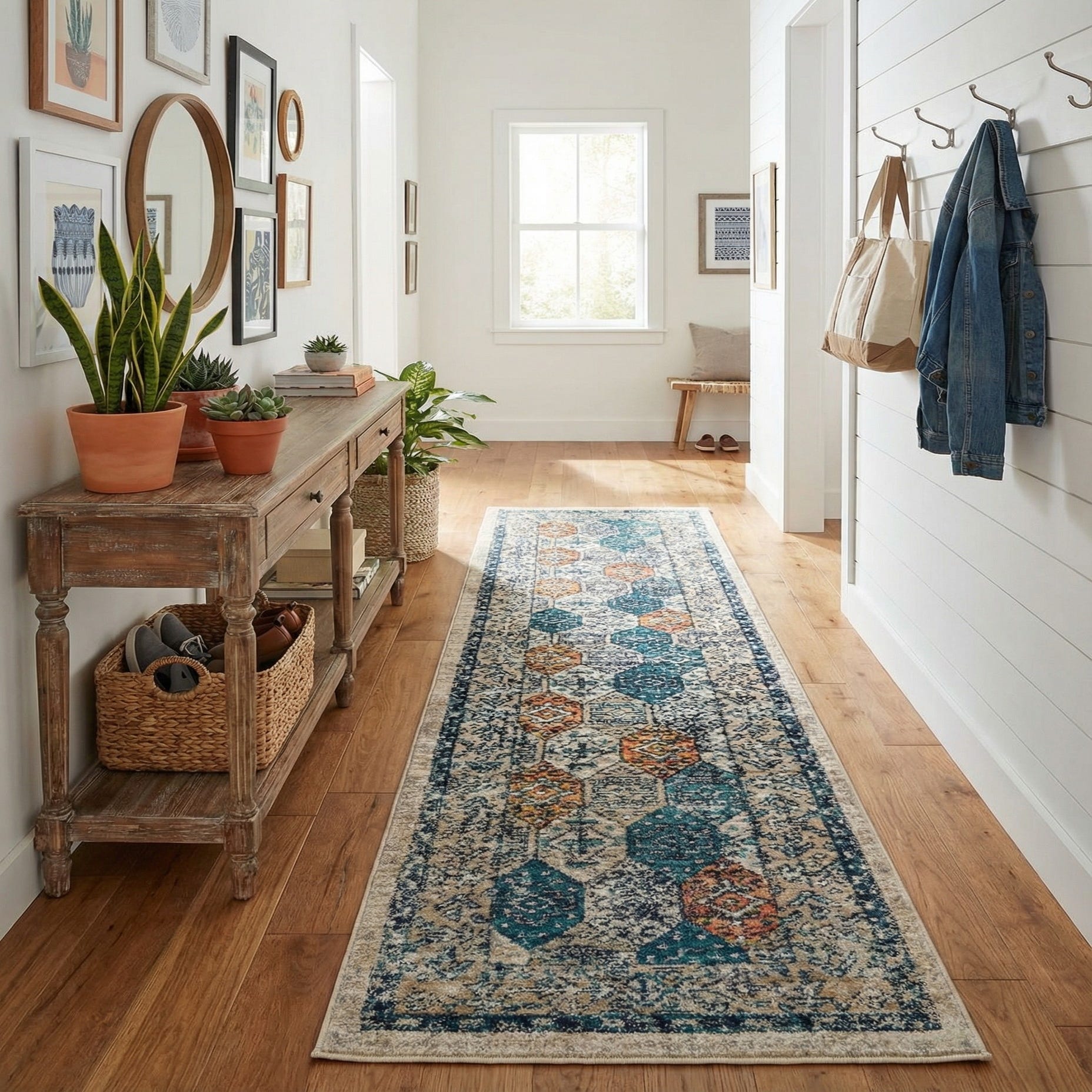 This runner works well in narrow, high-traffic areas such as hallways and entryways and brings color and pattern to a galley kitchen or along the side of a bed. It pairs nicely with warm wood tones, leather seating, or mid-century furnishings, and also complements neutral, modern farmhouse or transitional rooms where a mix of cool blues and warm terracotta can tie together upholstery, linens, and metal accents like brass or matte black.