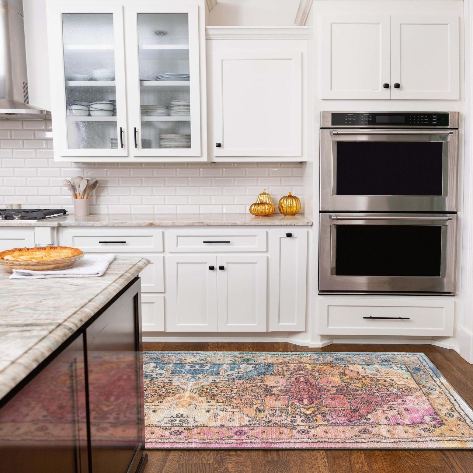 A vibrant 8 ft multi-colored runner rug with an intricate distressed pattern, ideal for a hallway or kitchen.