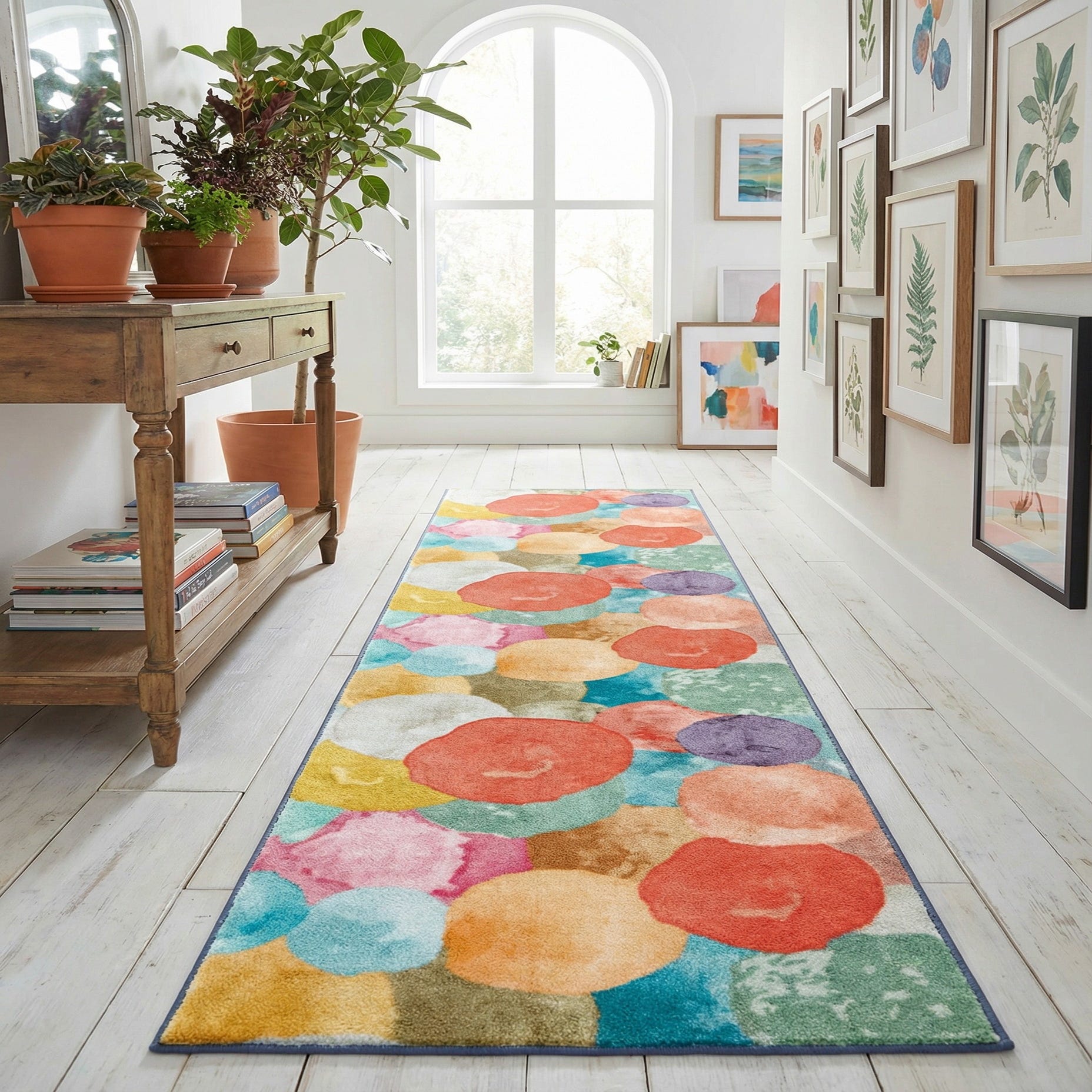 A vibrant multi-colored runner rug featuring large, irregular watercolor-style circles in shades of coral, yellow, blue, pink, and green, perfect for a hallway.