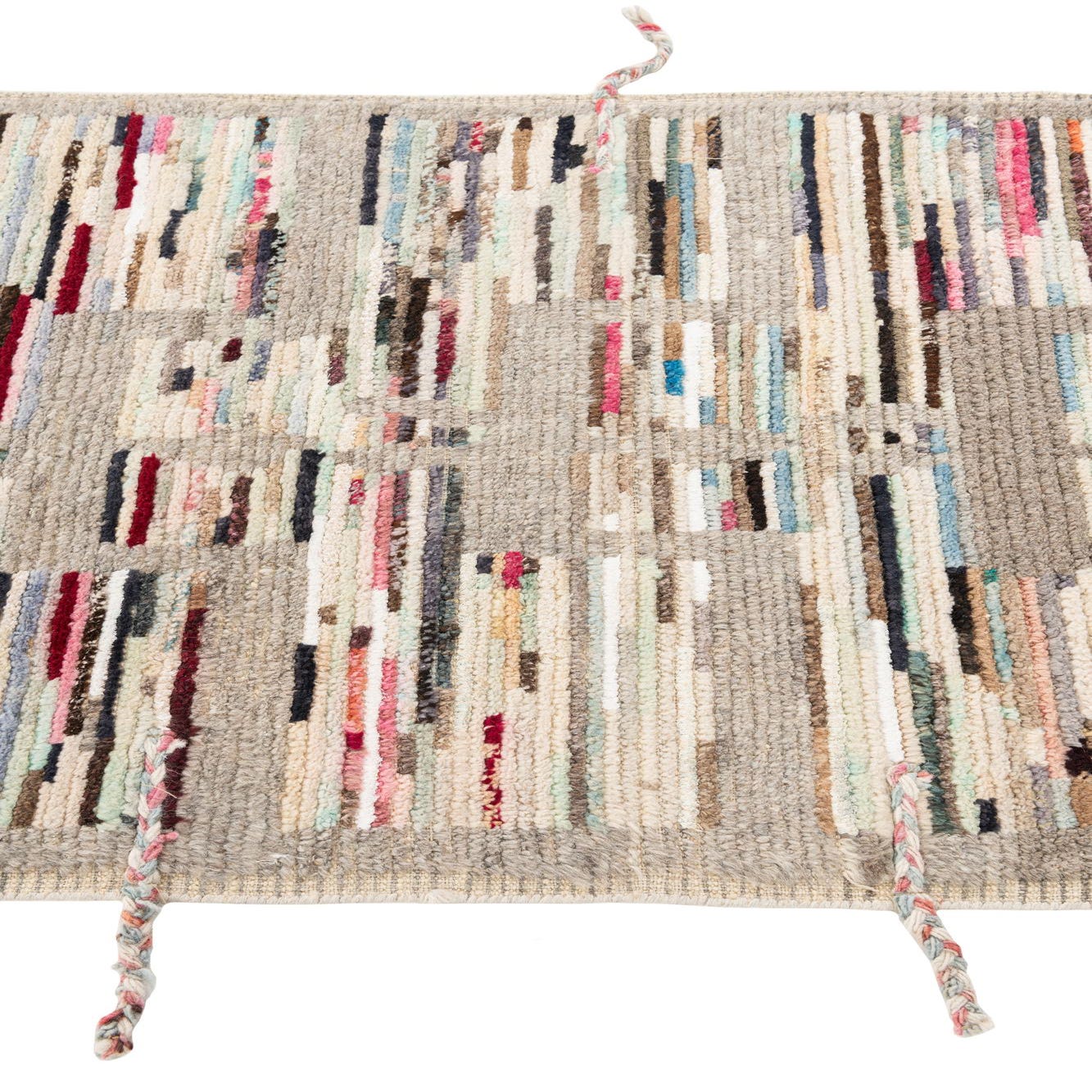 A handmade 8 ft runner rug with a multi-colored tribal pattern over a light gray base, featuring shag pile.