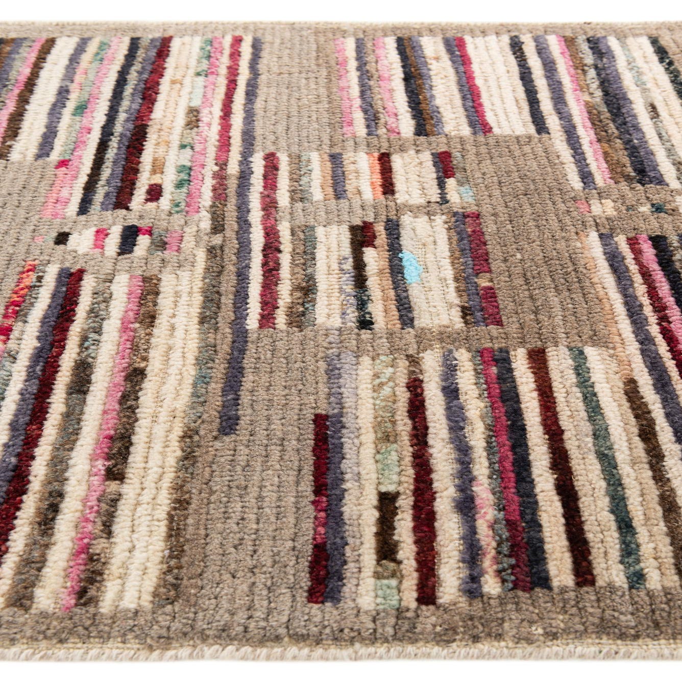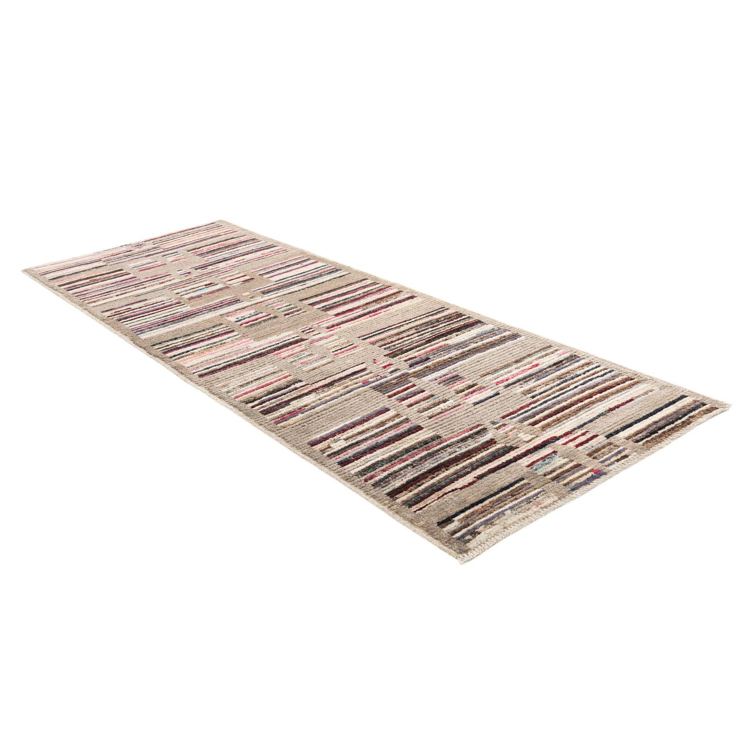 A multi-colored 8 ft runner rug with a tribal, modern, and oriental striped pattern on a shag pile.