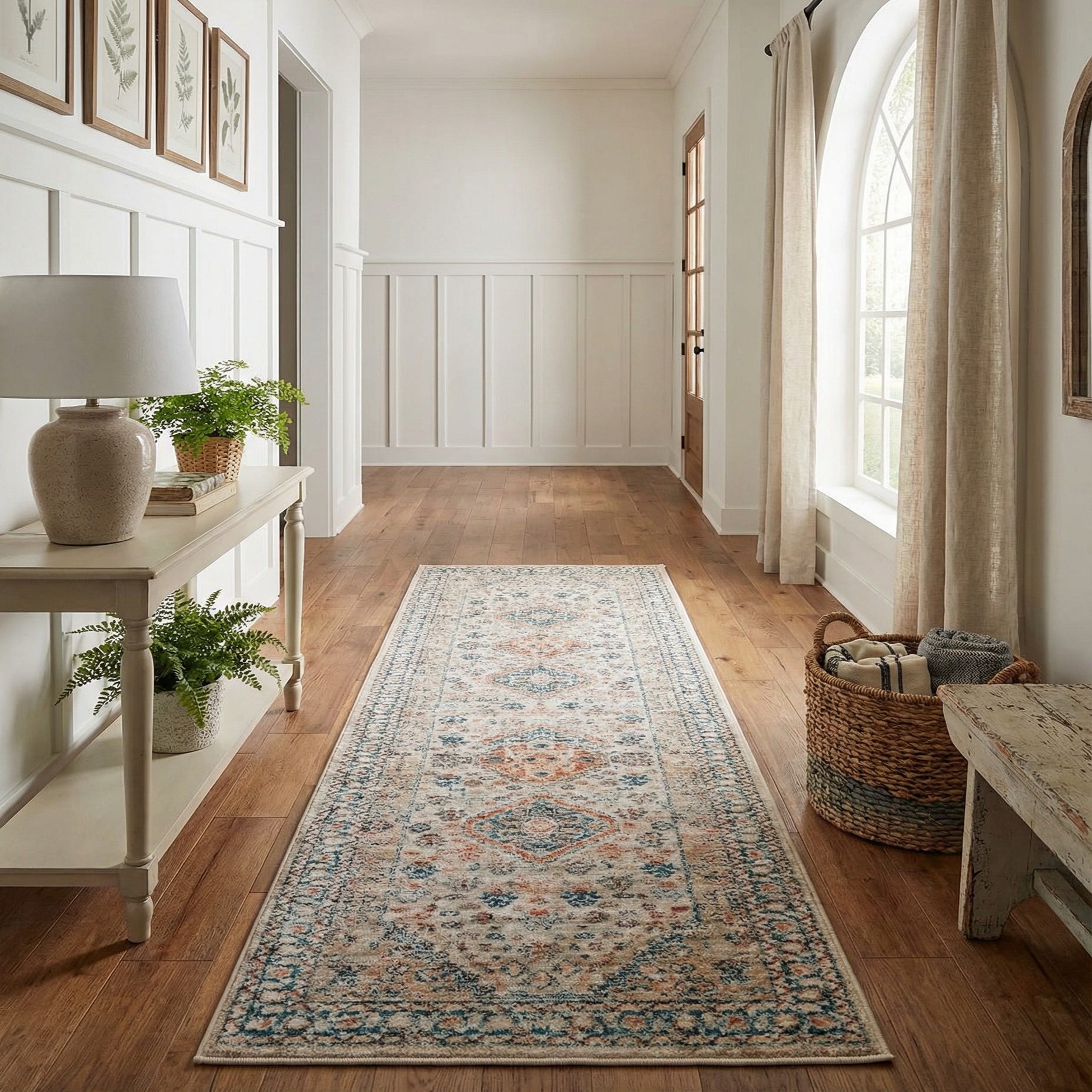 This rug works well in entryways and hallways to define a passage, beneath a narrow console, or alongside a kitchen galley. It pairs nicely with hardwood floors, painted floorboards, or neutral tile, and complements transitional, coastal, farmhouse, and traditional interiors. Use the rust and terracotta tones to tie in warm décor elements, or pick up the blues with pillows and artwork for a coordinated look.