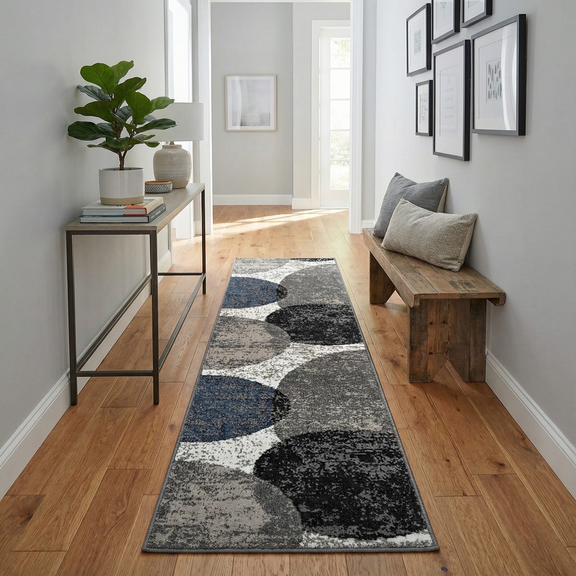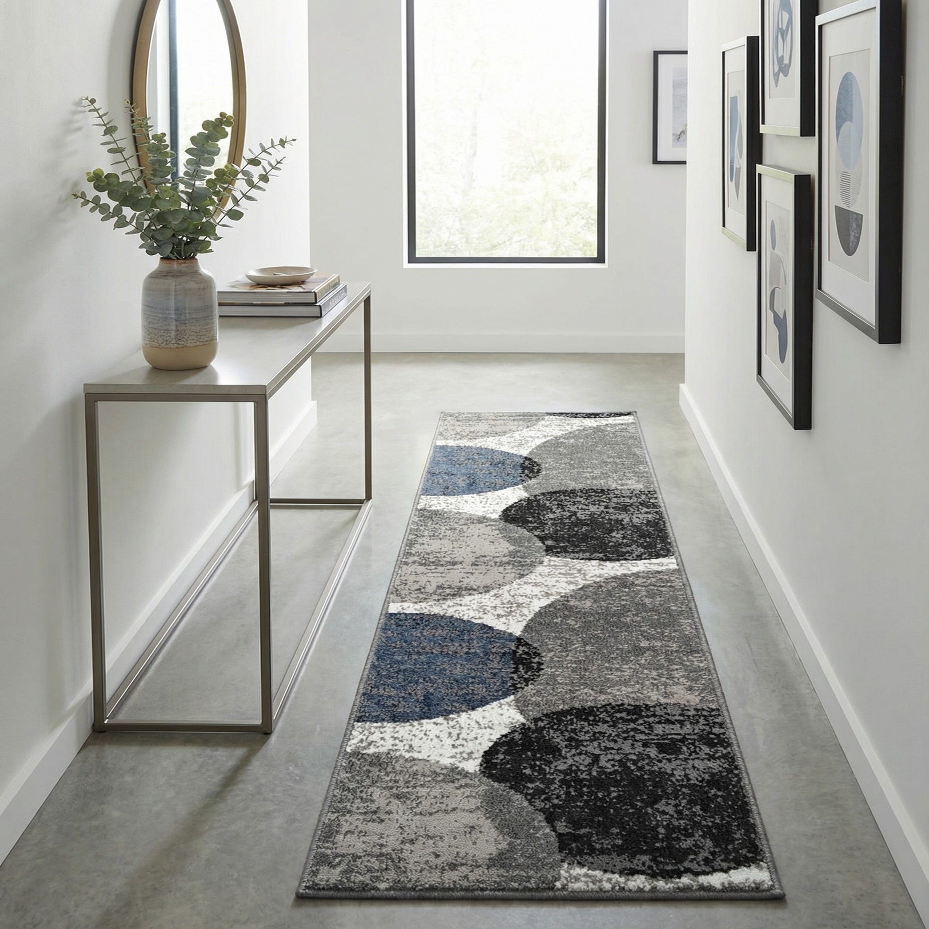 An abstract arrangement of overlapping circles and sweeping arcs gives this runner a contemporary, graphic look. The multi background supports shapes in blue, black, ivory and shades of gray that contrast against one another while maintaining a grounded palette. Machine-made from 100% polypropylene, the rug has a dense, low-to-medium pile that feels soft underfoot with a subtle low sheen and a slightly textured surface where the pattern is defined.