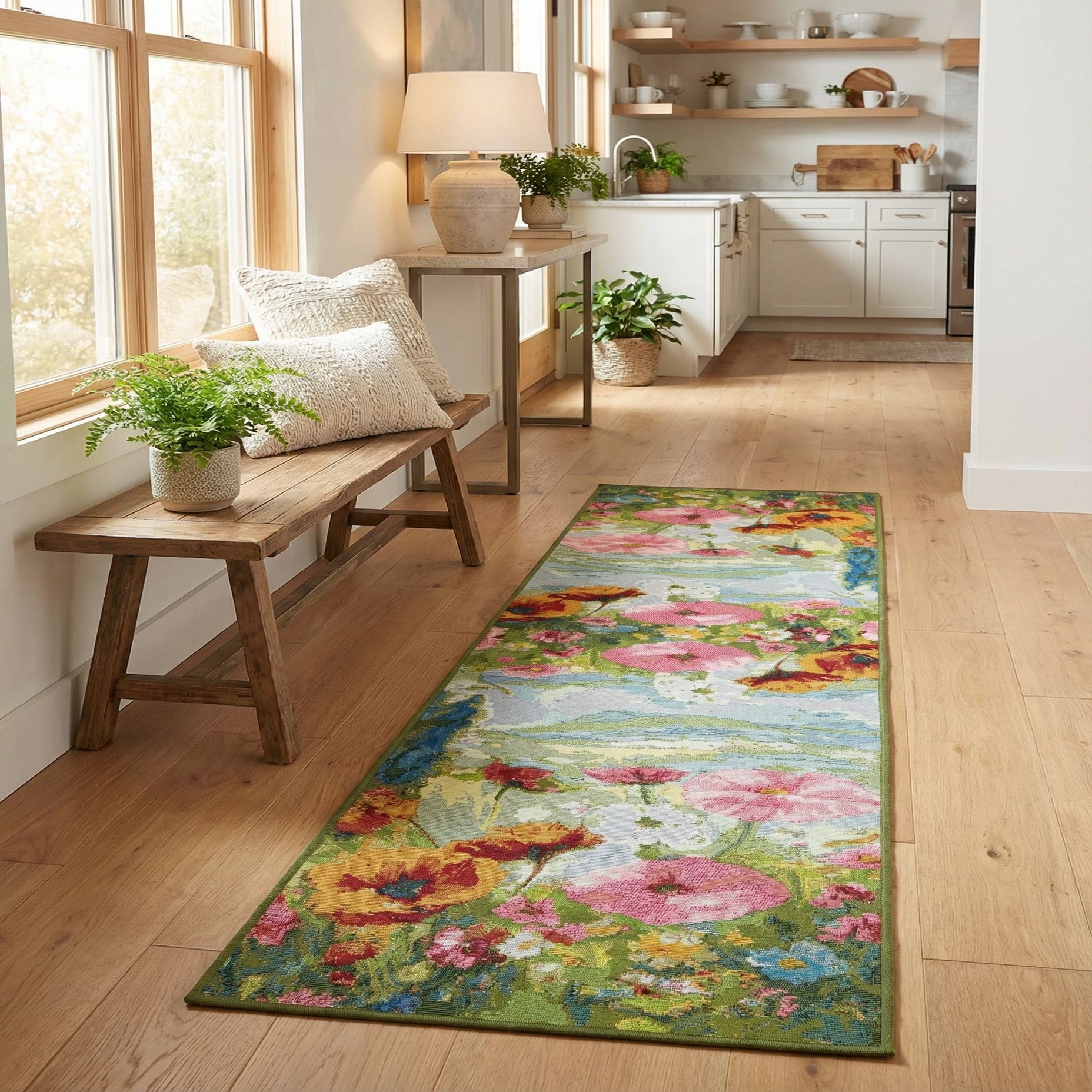 Use this runner to bring a lively, garden-inspired touch to transitional and casual spaces—a hallway that needs color, a covered porch or sunroom, or as a cheerful kitchen runner between counters. It pairs well with natural wood tones, painted cottage-style furniture, woven rattan or wicker seating, and crisp white or pale blue accents to let the floral palette stand out.