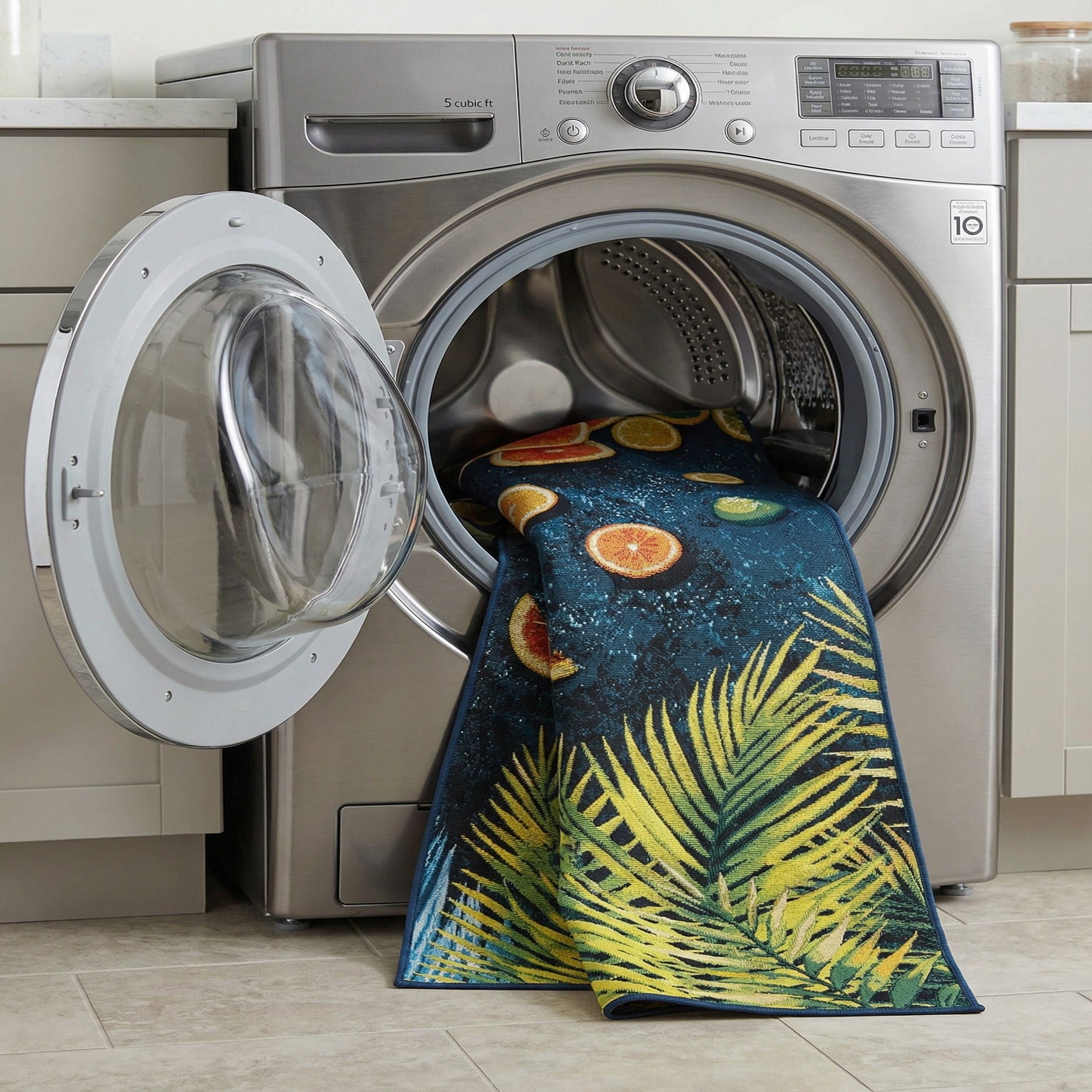 A vibrant 8 ft runner rug with a modern abstract design featuring green palm fronds and sliced citrus fruits on a dark blue background.